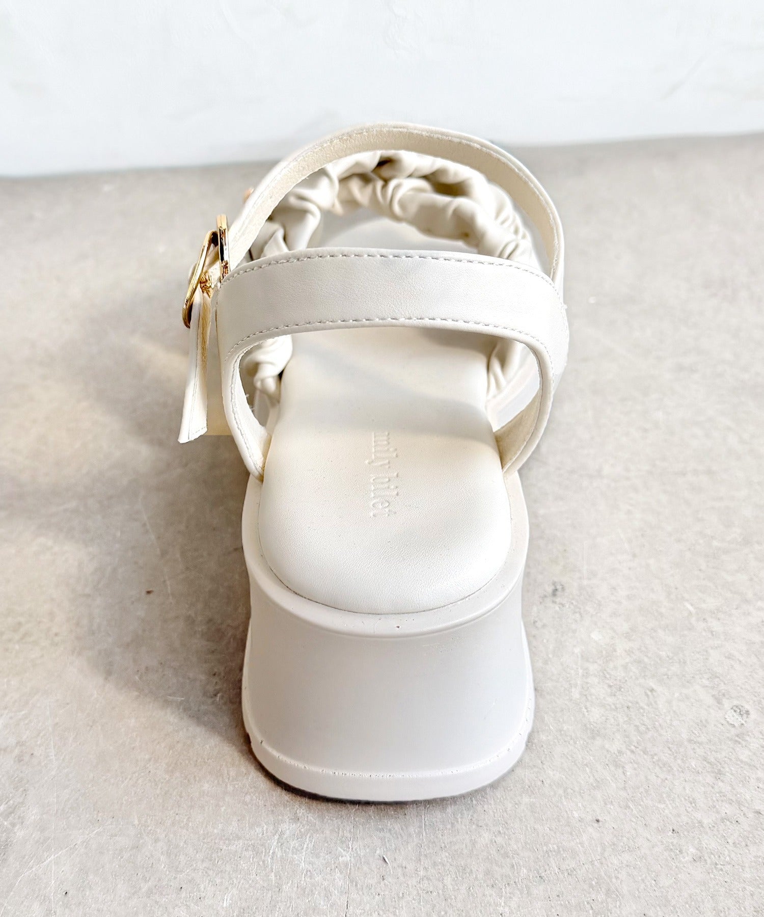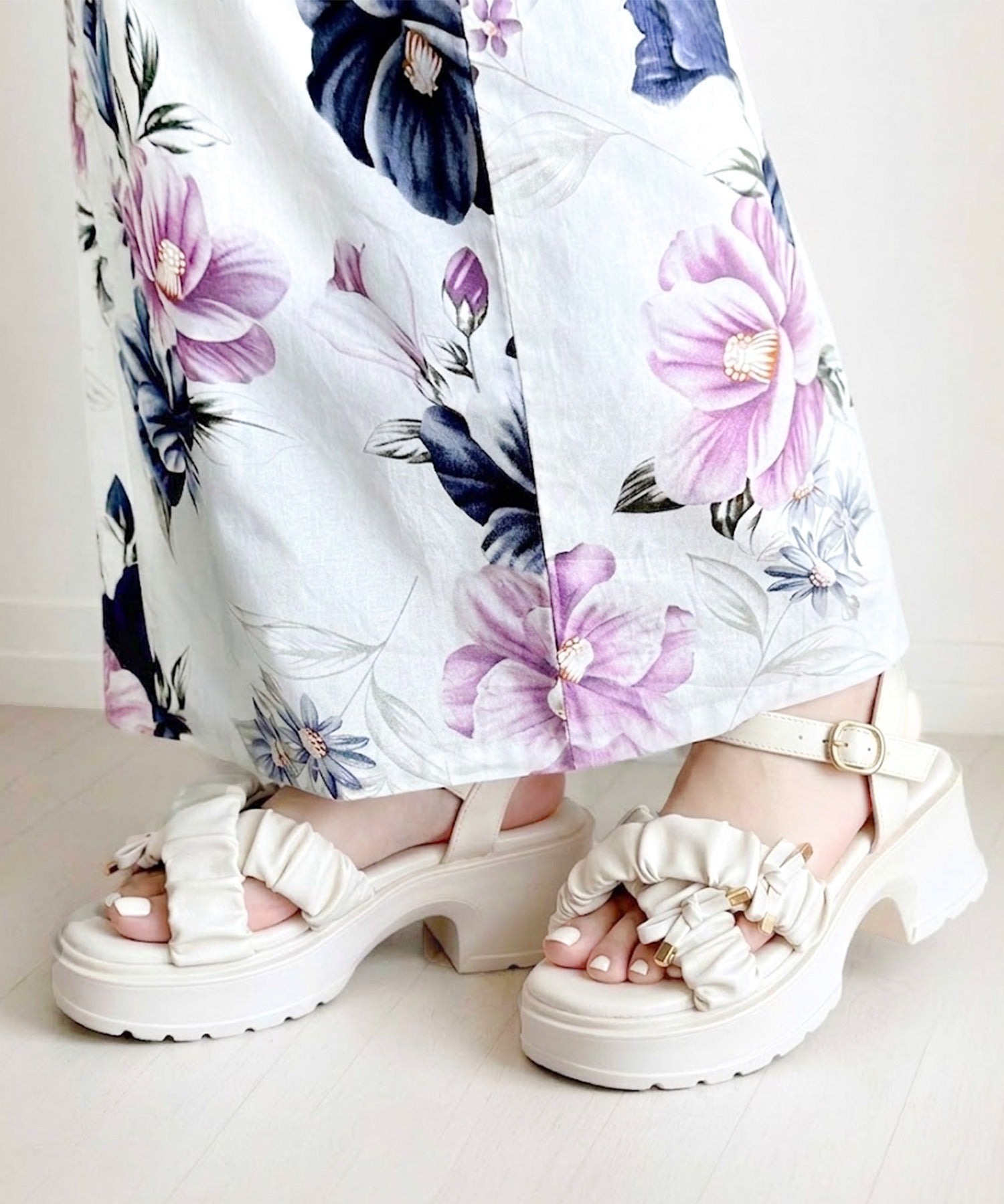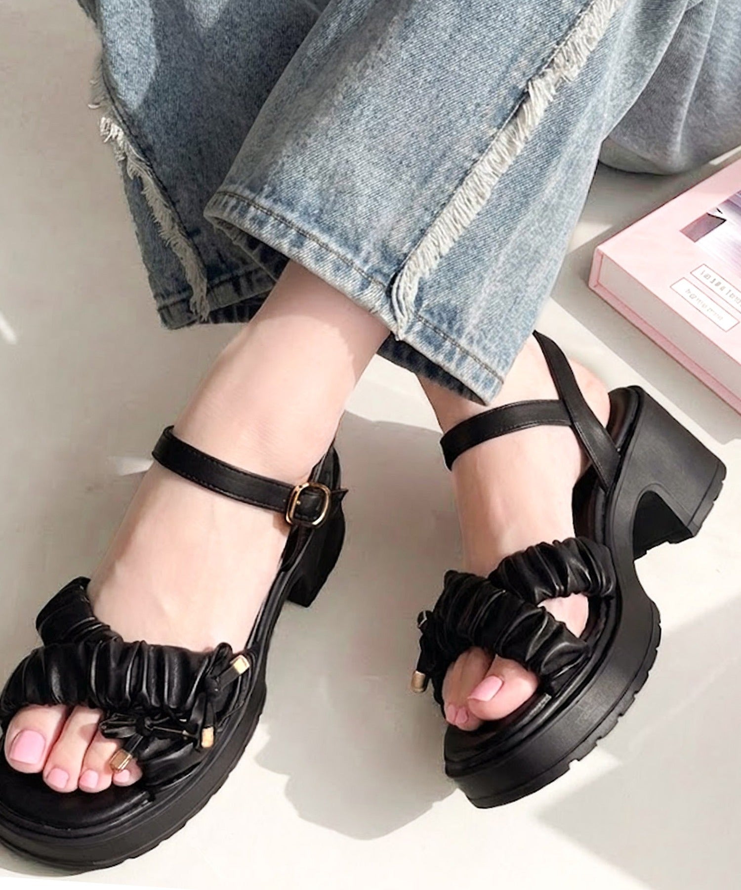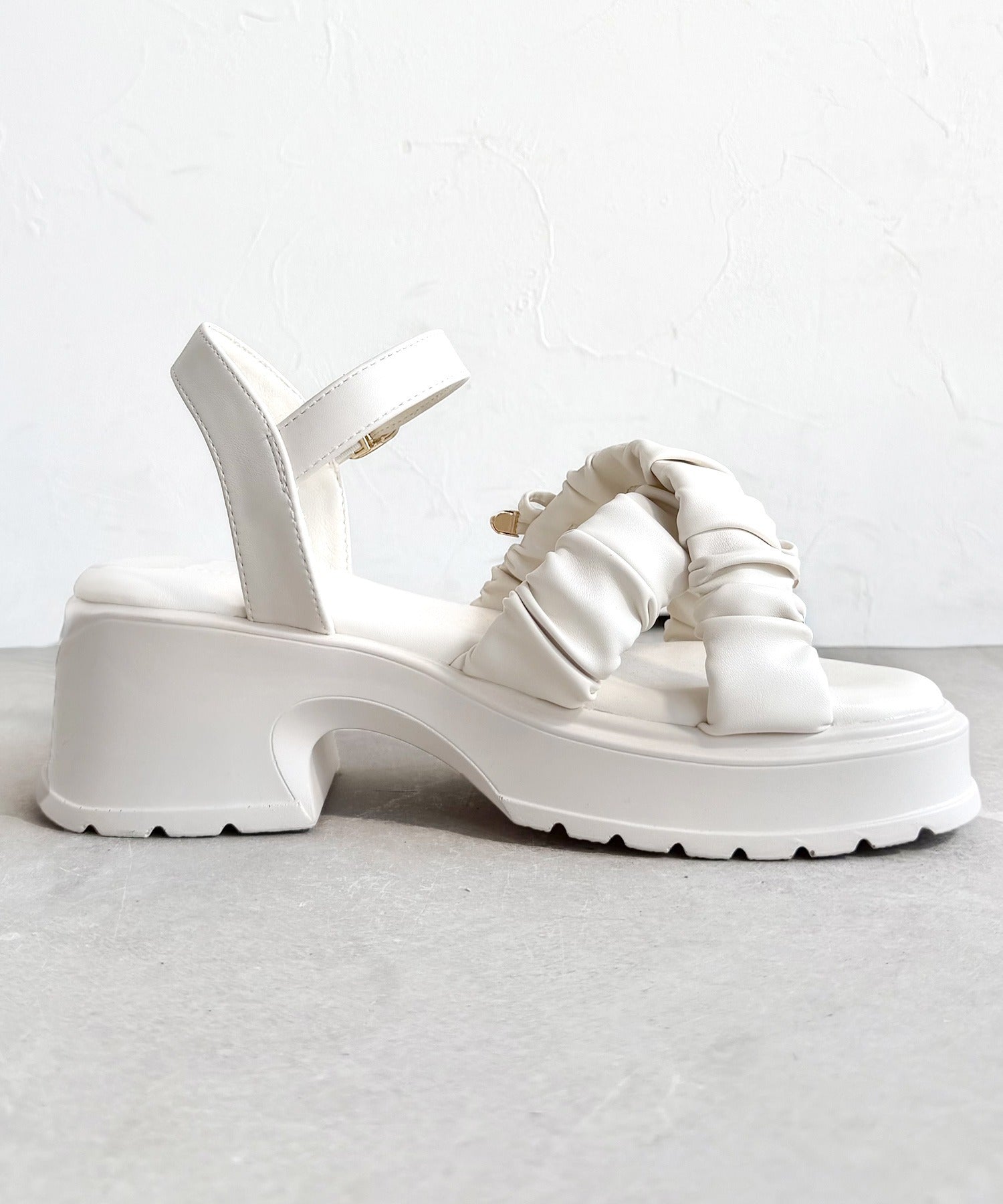 ふっくらとしたギャザーストラップが足元を華やかに演出。