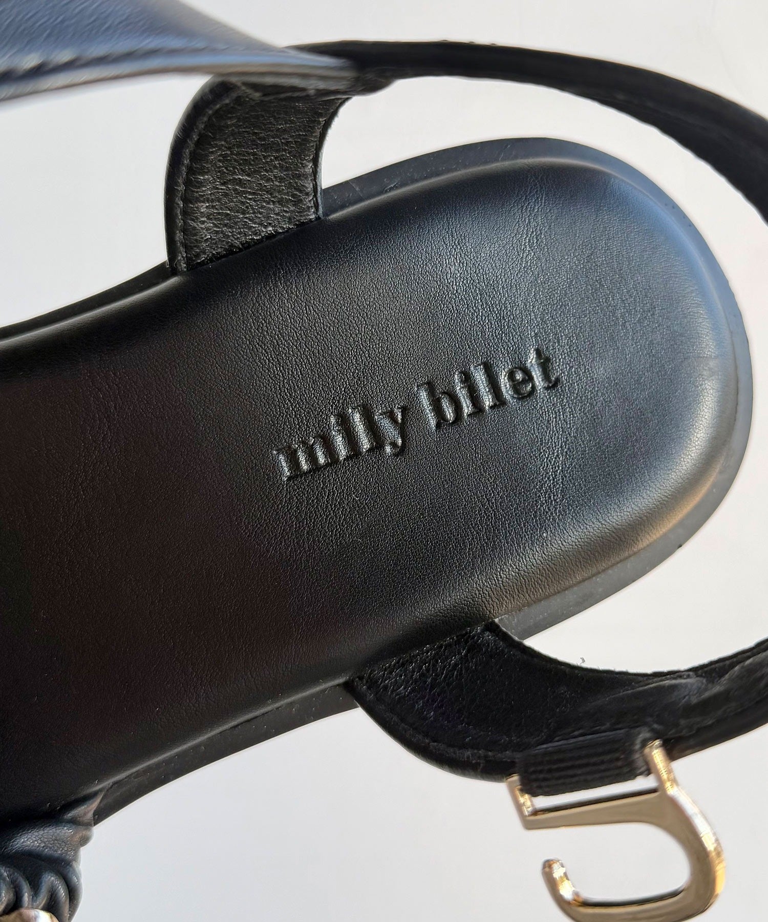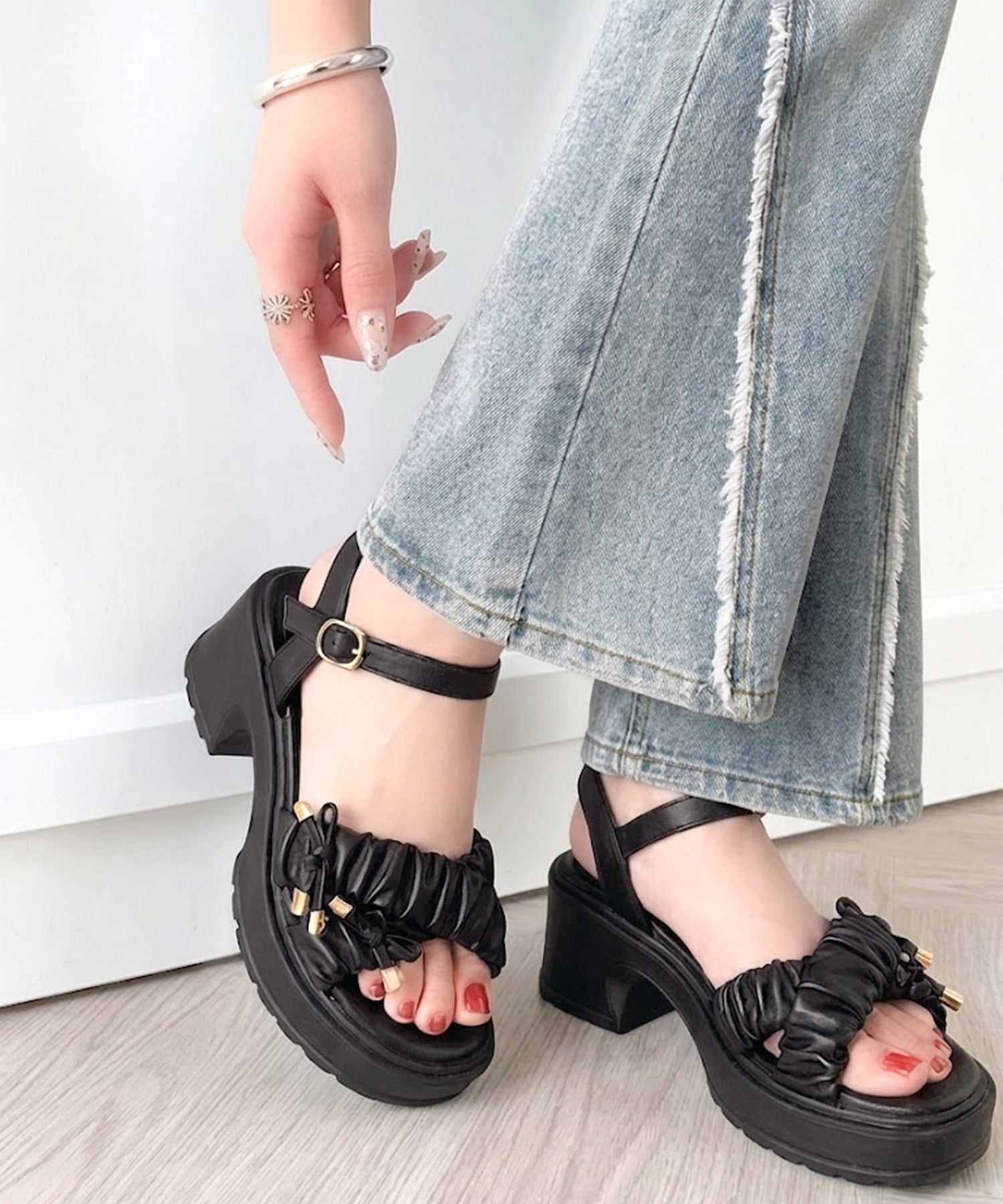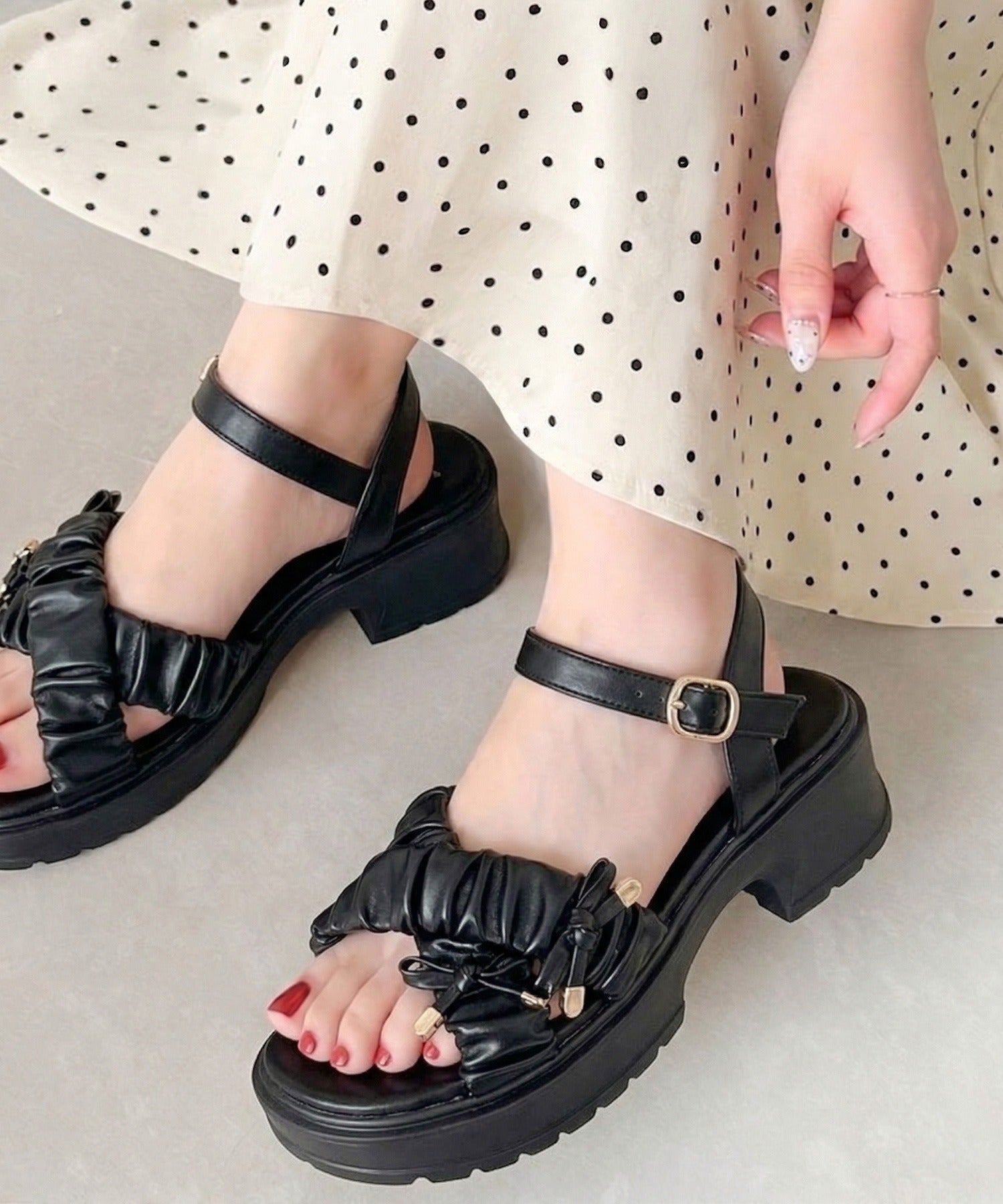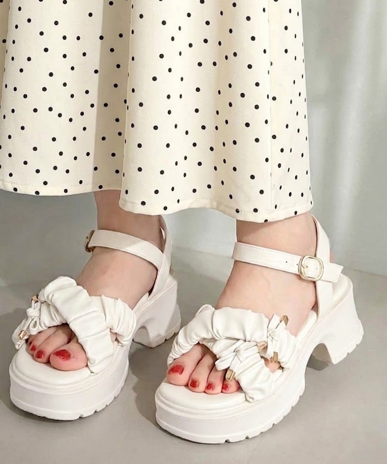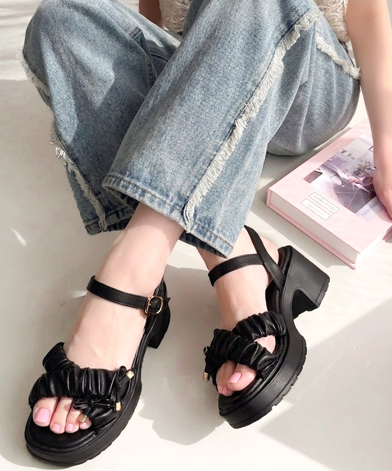 ふっくらとしたギャザーストラップが足元を華やかに演出。