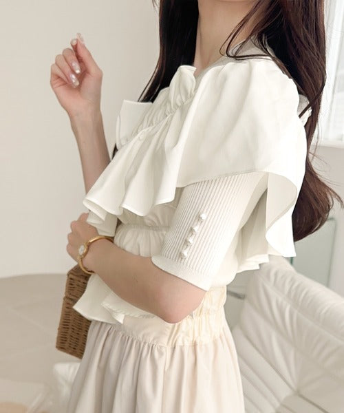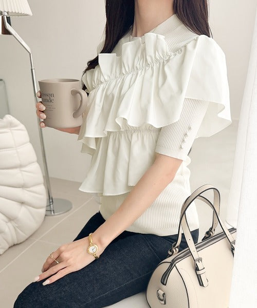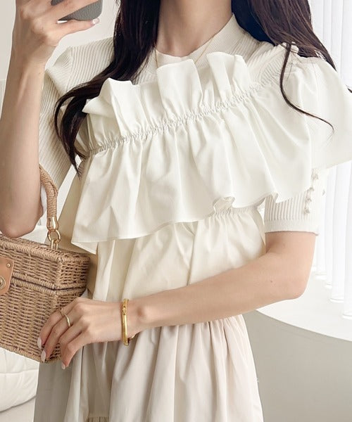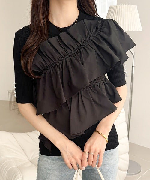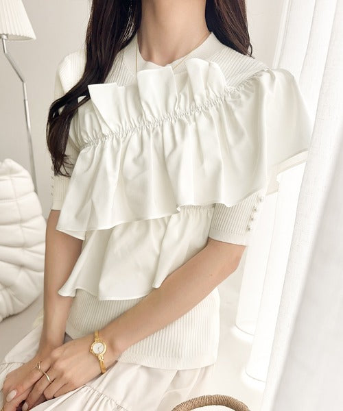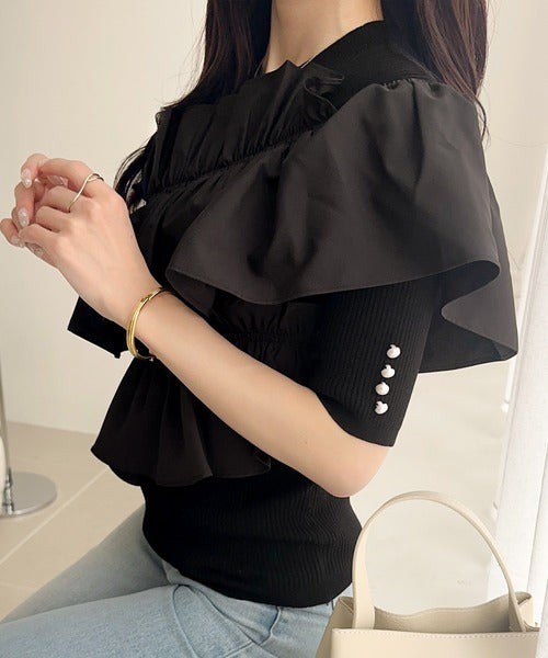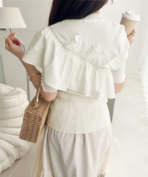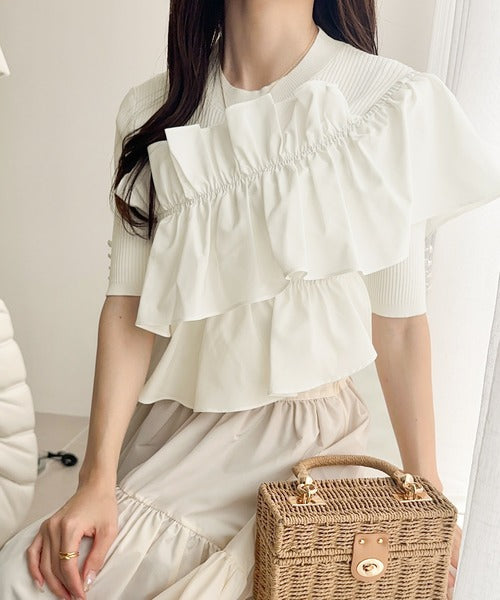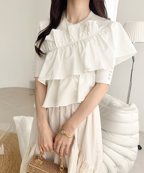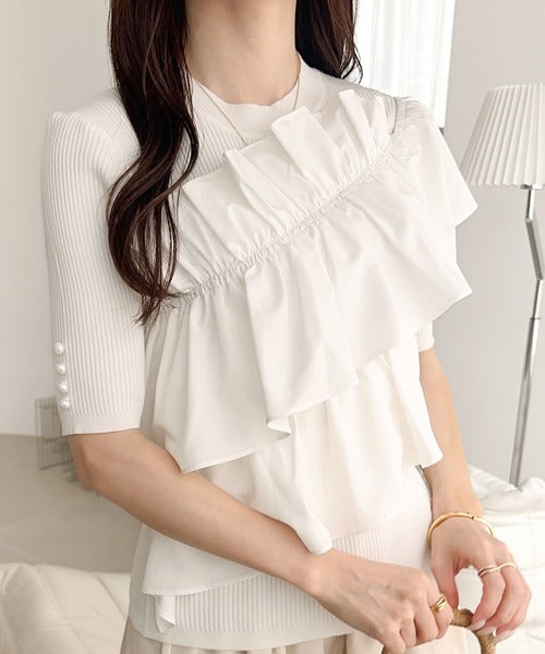 【mily bilet】大人の華やかな旬スタイル。パールボタンフリル使いサマーニット(半袖) mi1139080