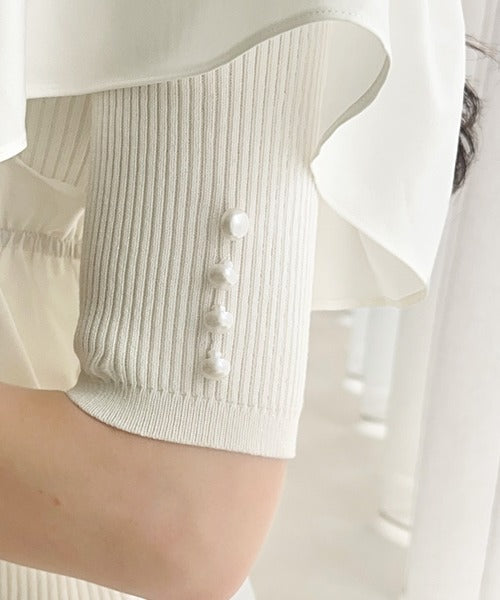 袖口のパールボタンが上品さをプラスし