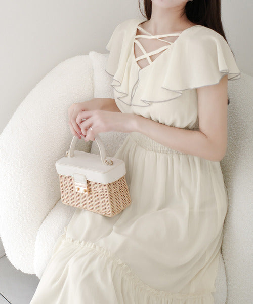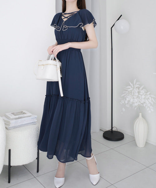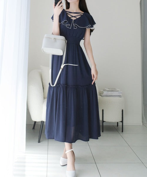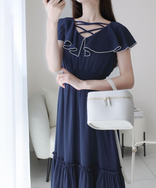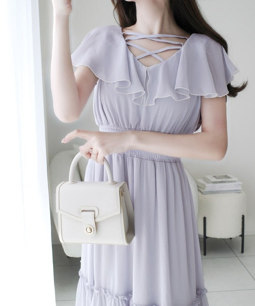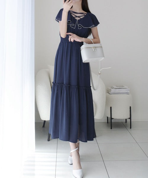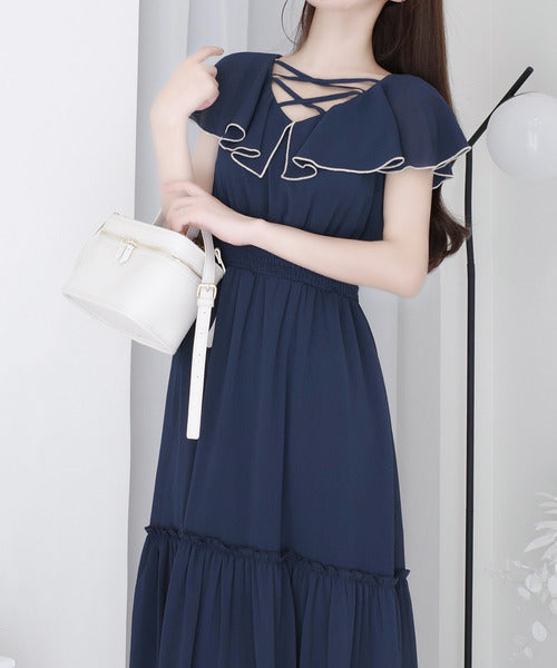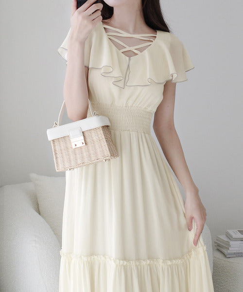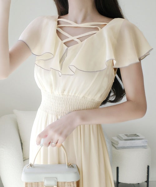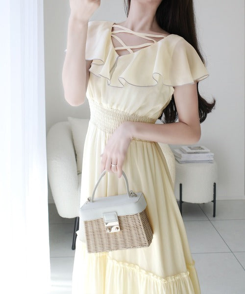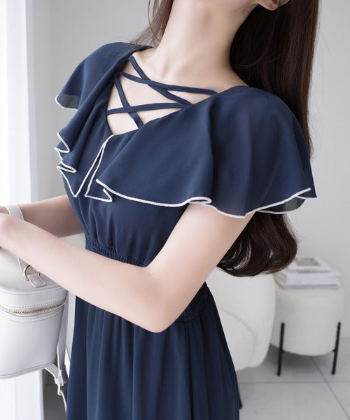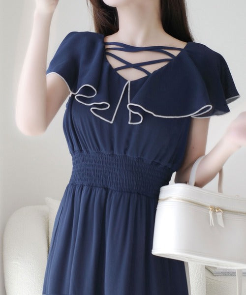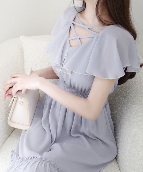 【mily bilet】今季上品に大活躍♪クロスデザイン楊柳使いフリル襟ワンピース mi1139081