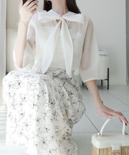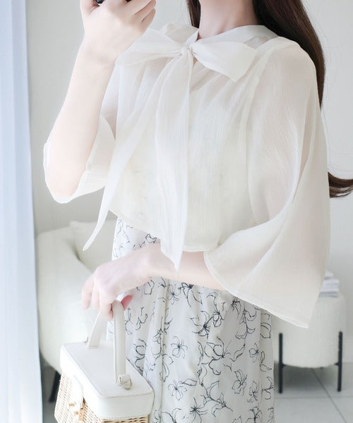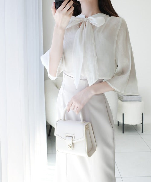 優しいアイボリー色のブラウスは、前でリボンを結べば清楚な印象に。