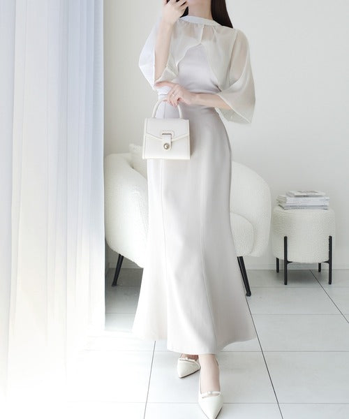 タイトなフレアスカートの縦長シルエットでスタイルアップデザイン。