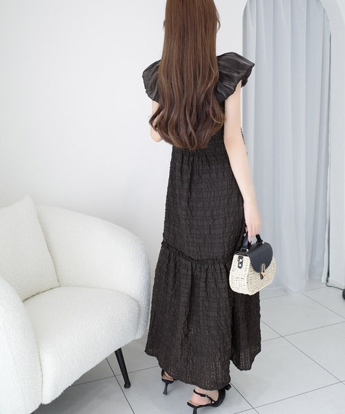 裾にはティアードデザインを施し、軽やかさとフェミニンさを兼ね備え、