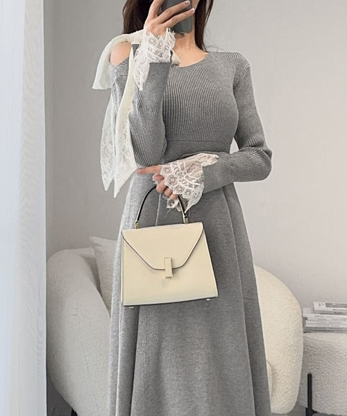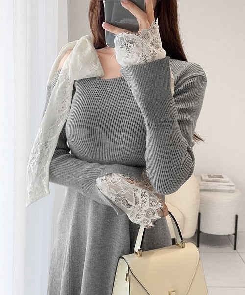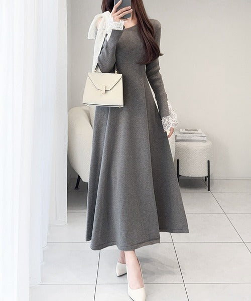 上部はリブ編み、下部は天竺編みに切り替えたニットワンピース。