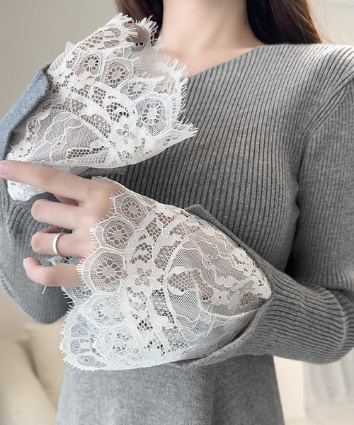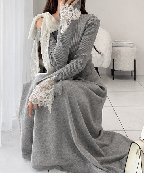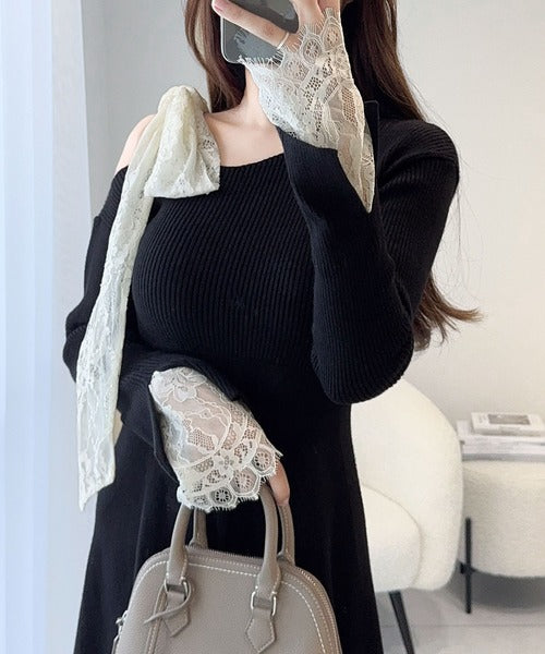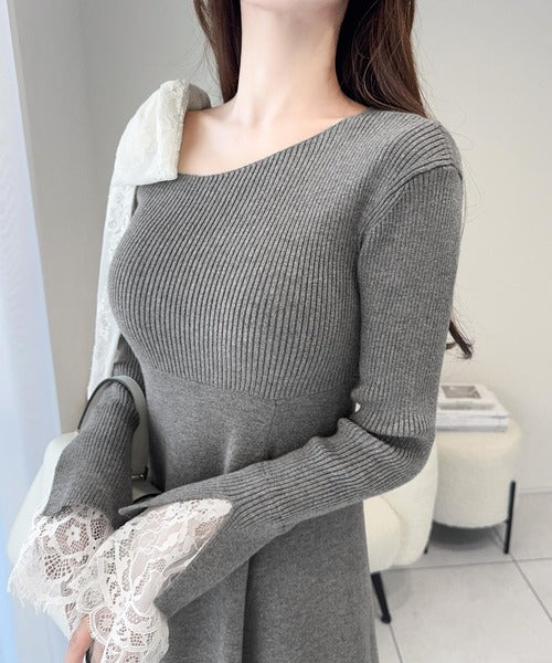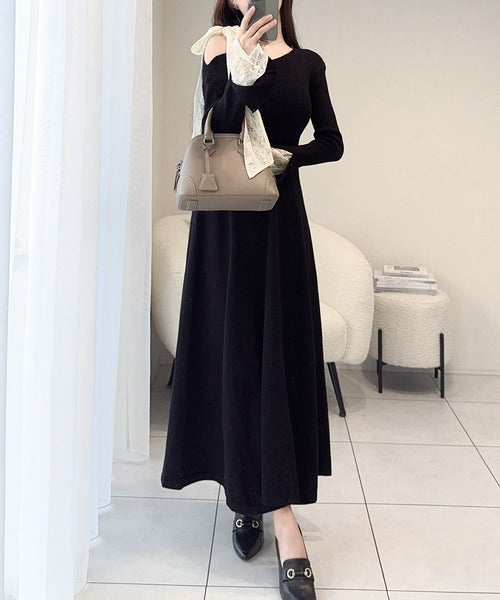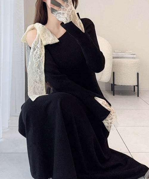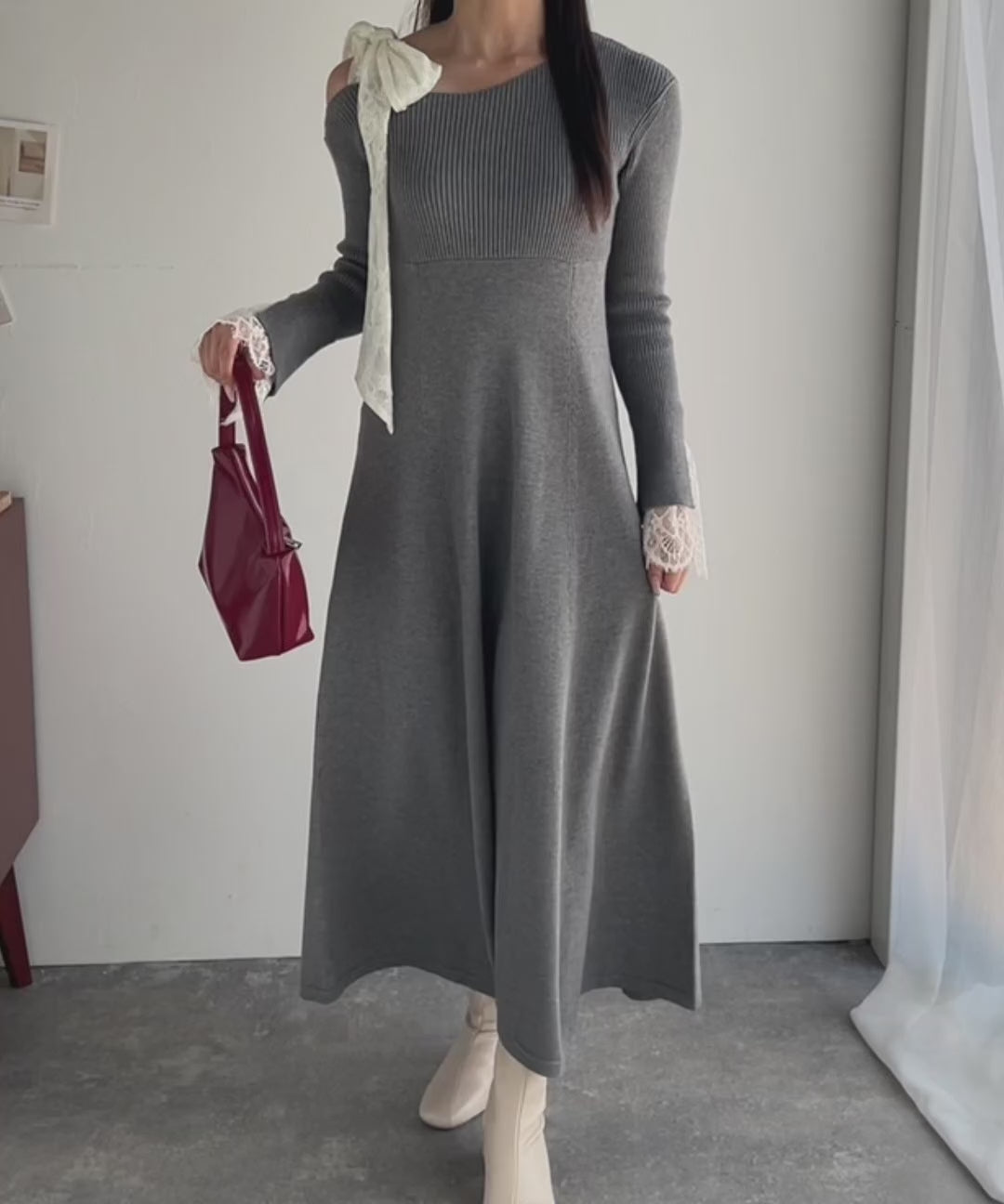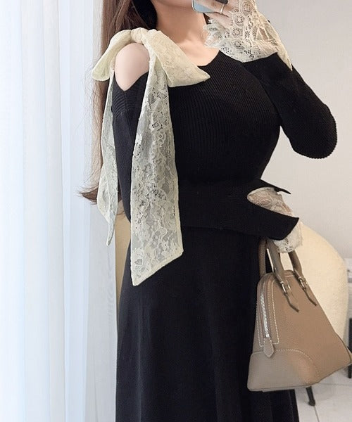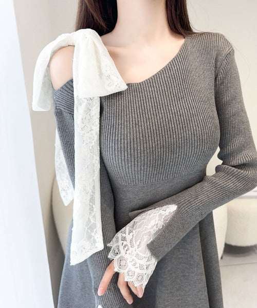 【mily bilet】華やかリボンで映える◎レースリボン使いワンオフショルニットワンピース mi1139090