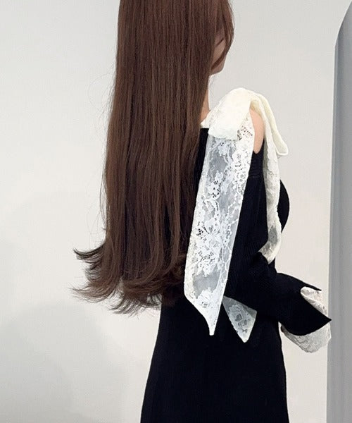 肩に配された存在感あるバイカラーレースリボンが華やかなアクセント。