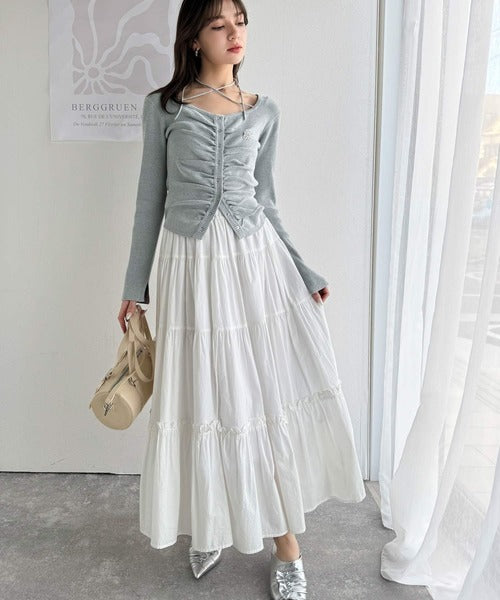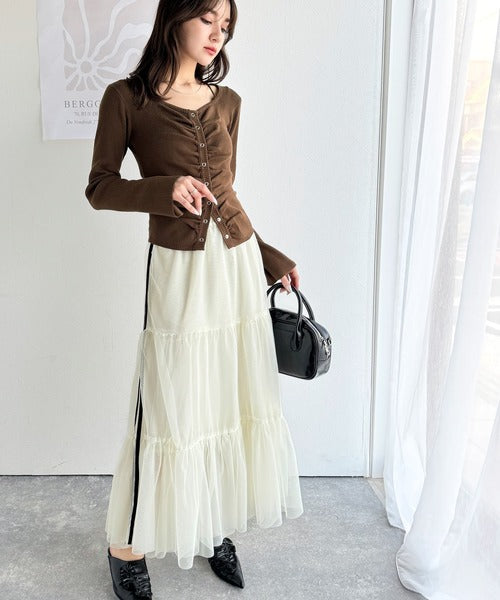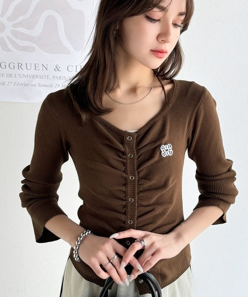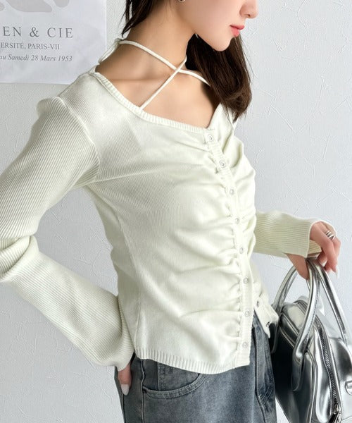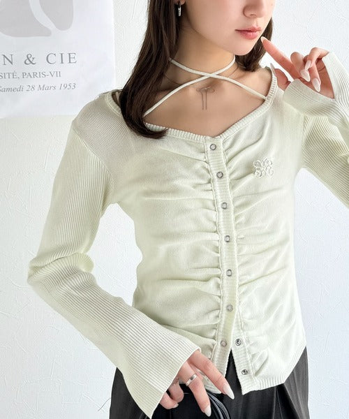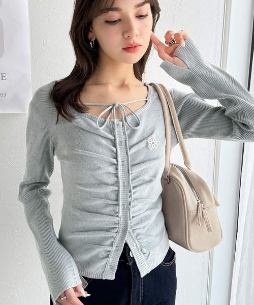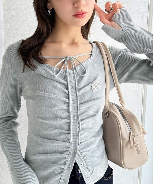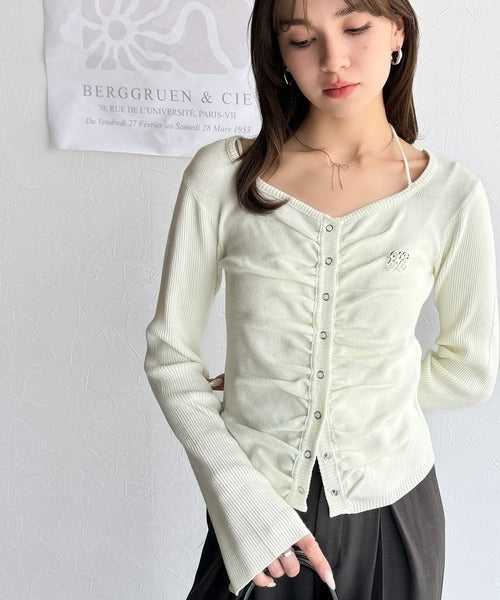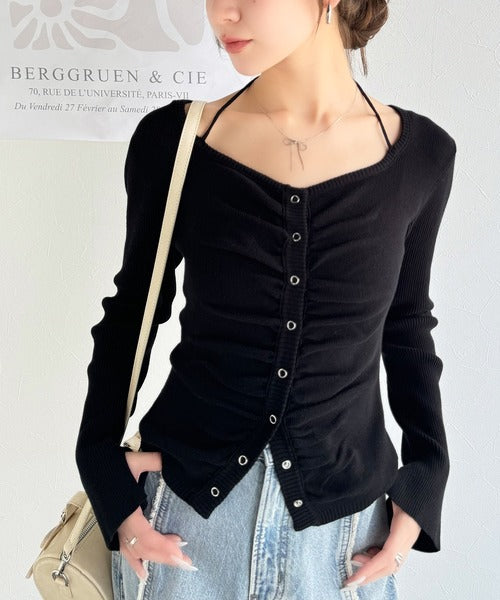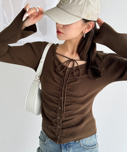 デコルテを美しく見せる胸シャーリングデザインのニットトップス。