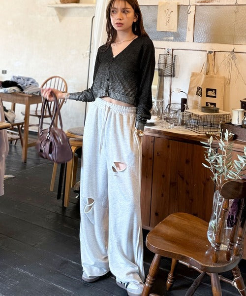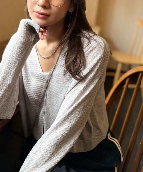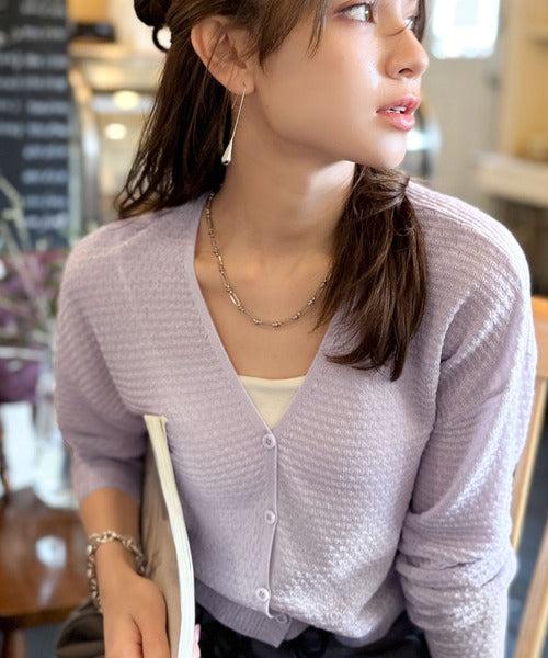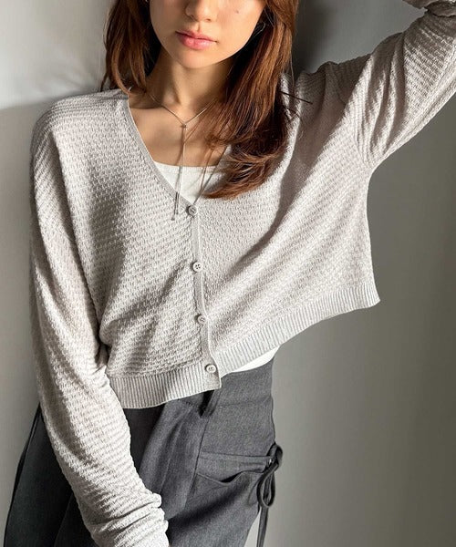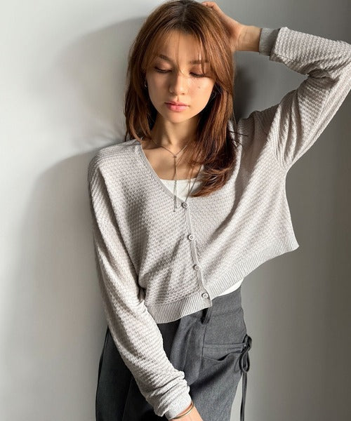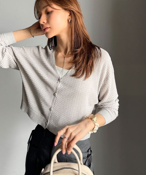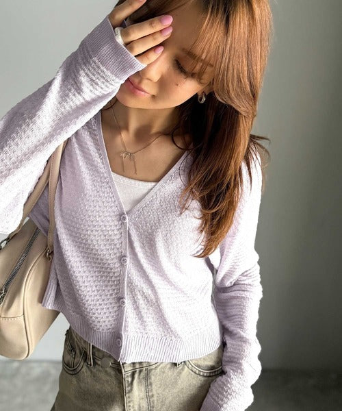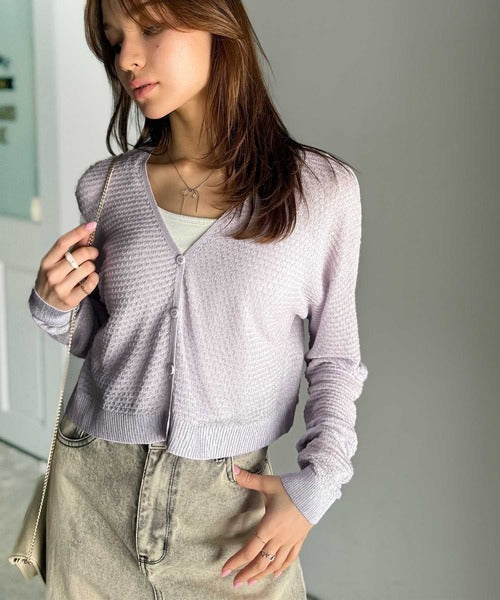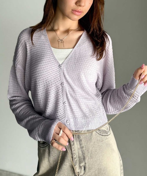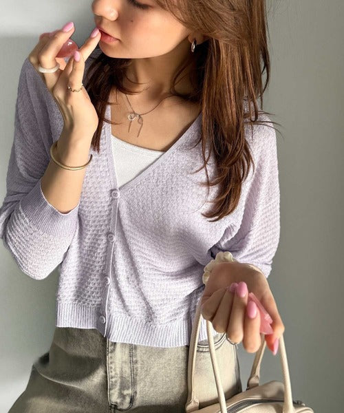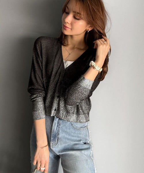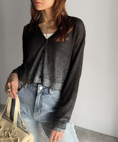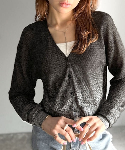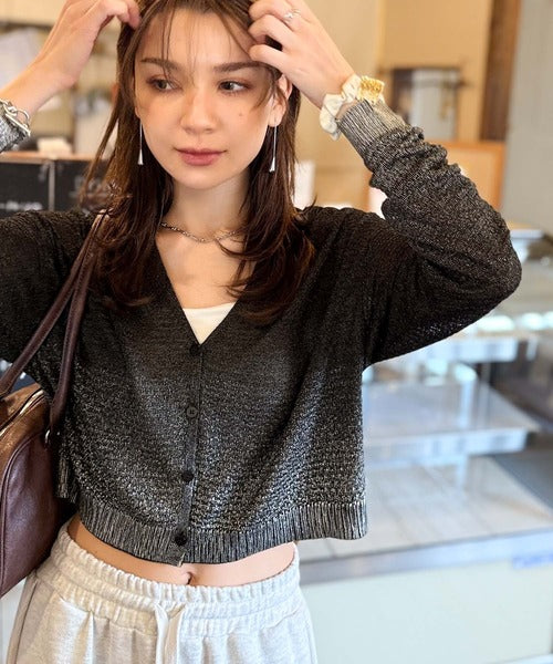 【mily bilet】抜け感とキラ感、どっちも欲張るのが正解◎箔プリントメッシュショート丈Vネックカーディガン(長袖) mi1259016