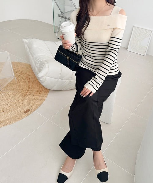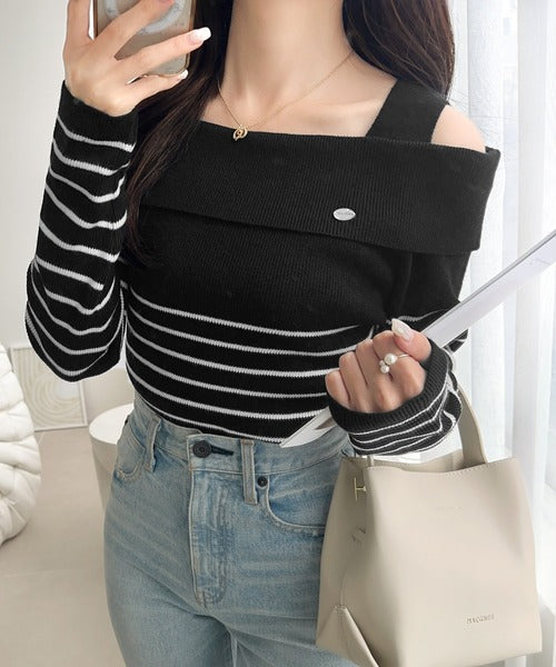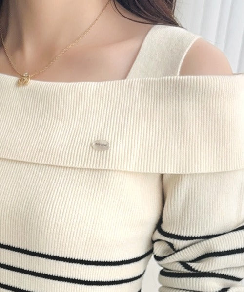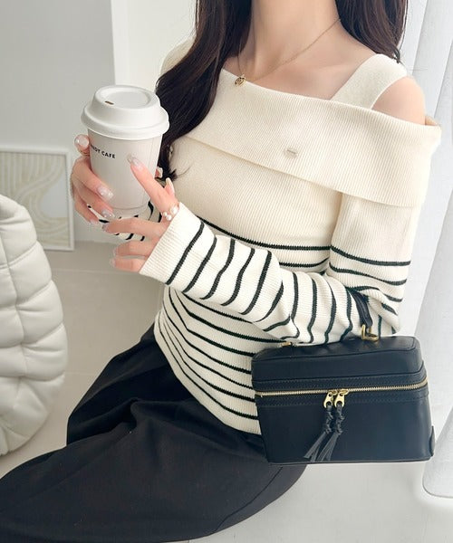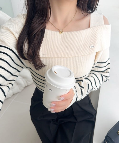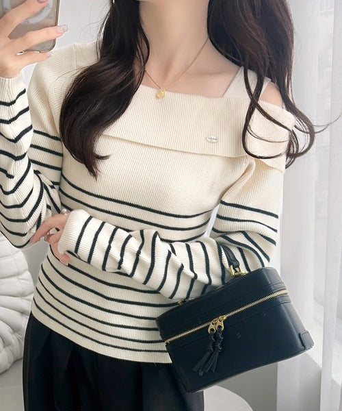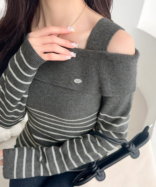 【mily bilet】抜け感たっぷり大人の肌見せ。ワンオフショルアクセントボタンボーダーニット(長袖) mi1259019