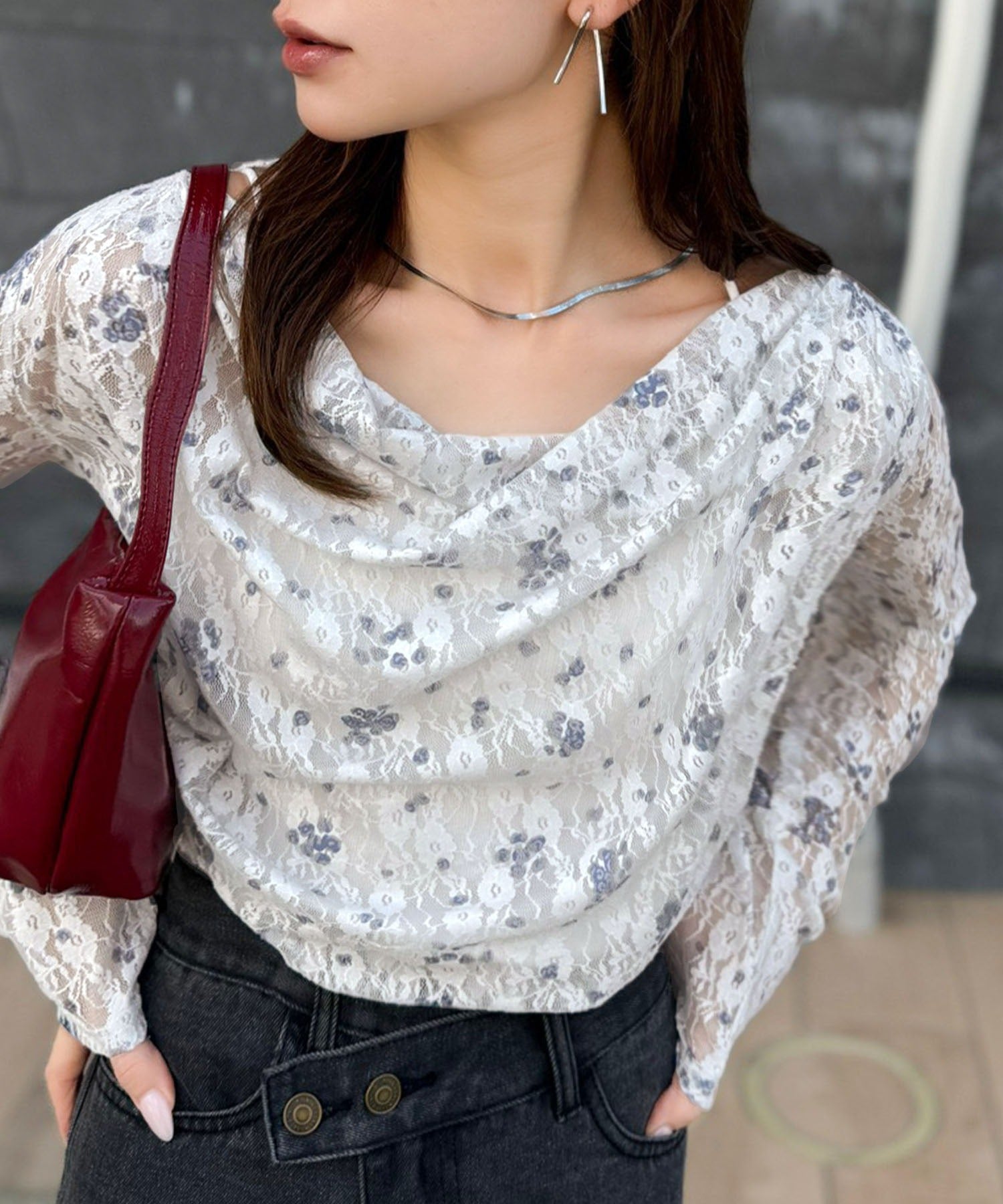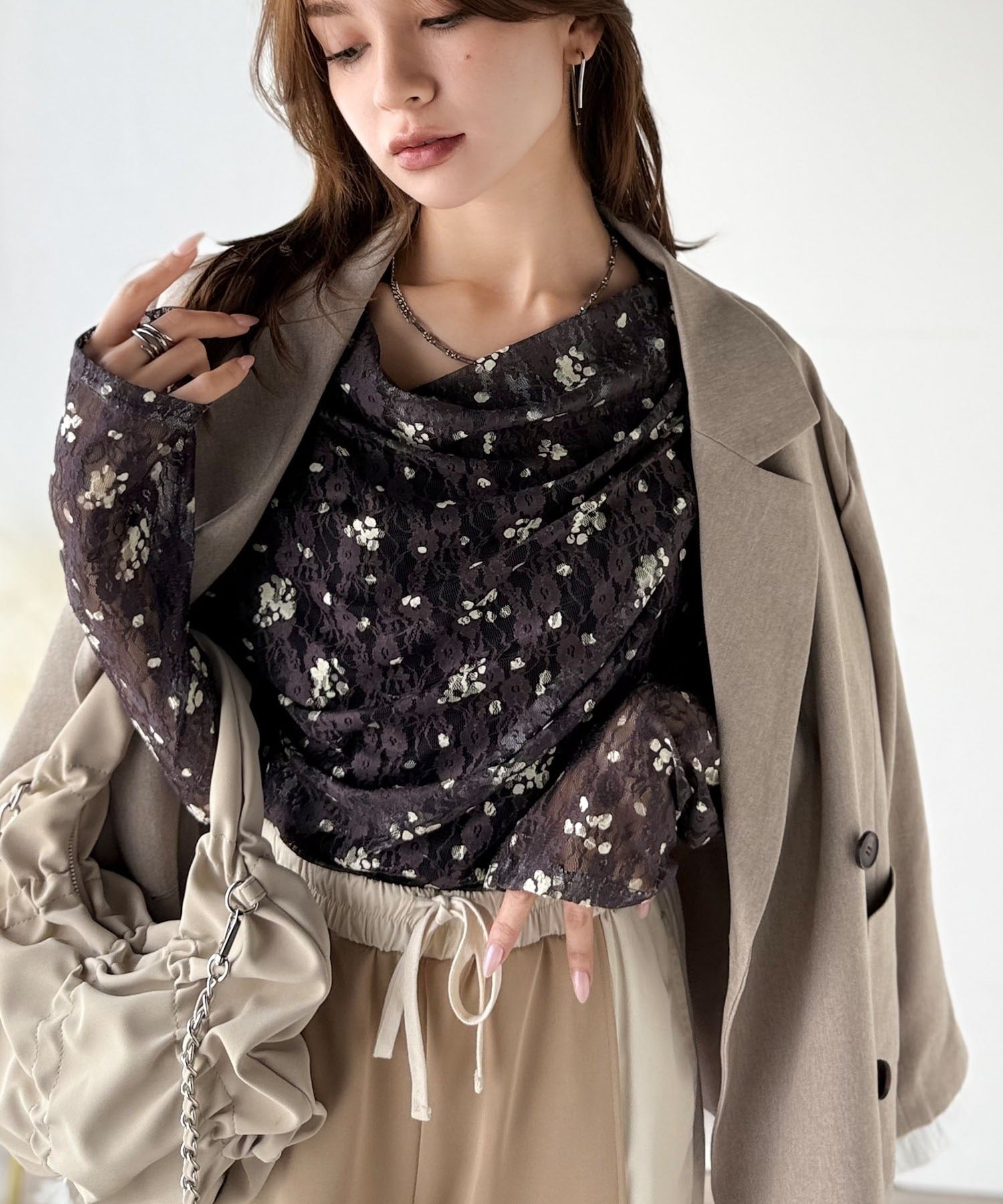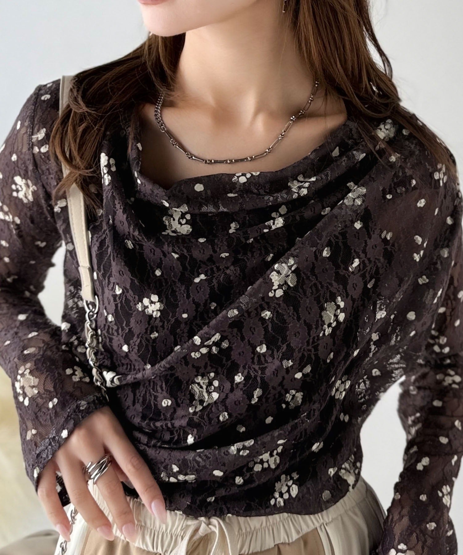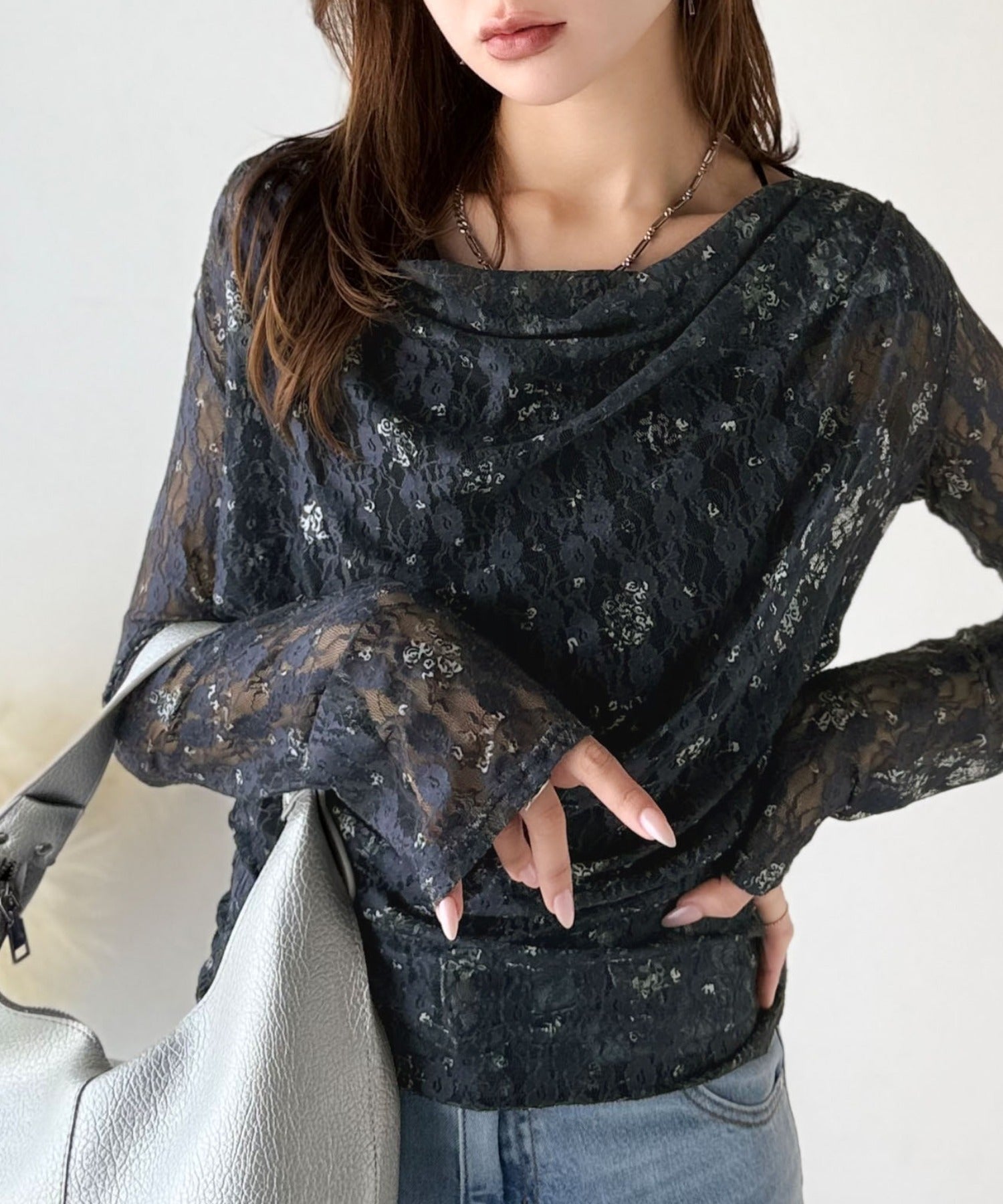 総柄レースがフェミニンな雰囲気を醸し出し、ドレープデザインで甘すぎない大人っぽさに◎