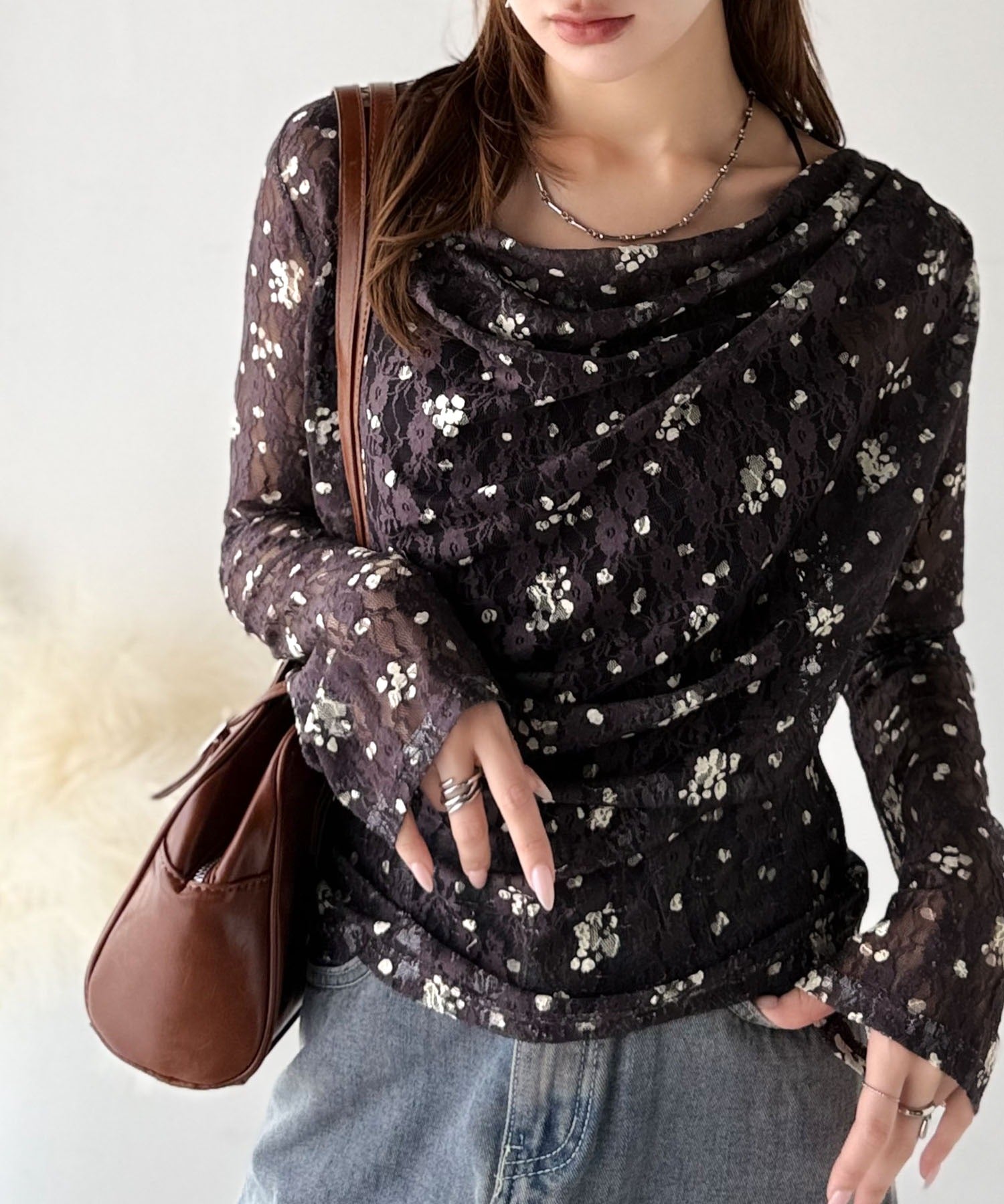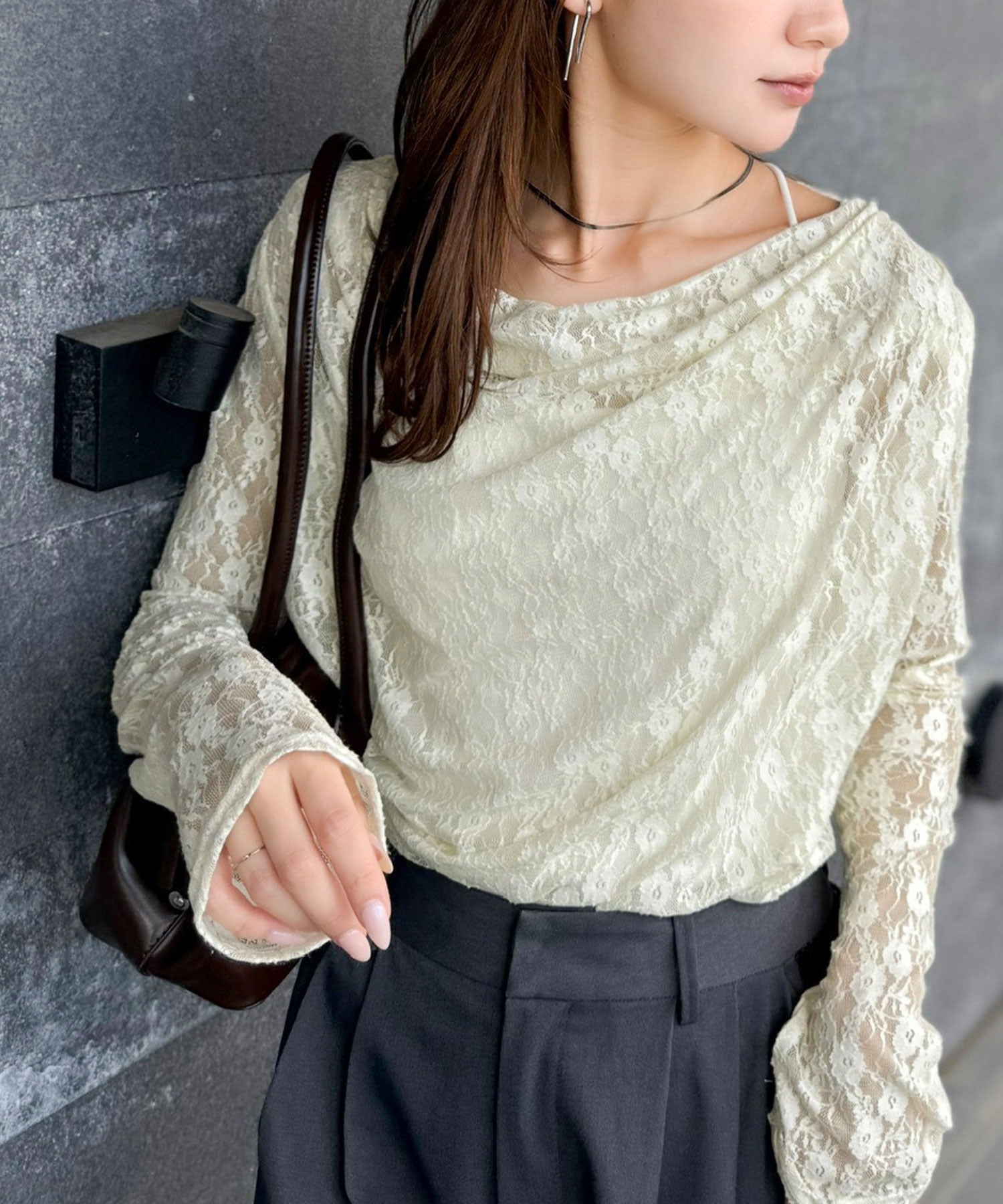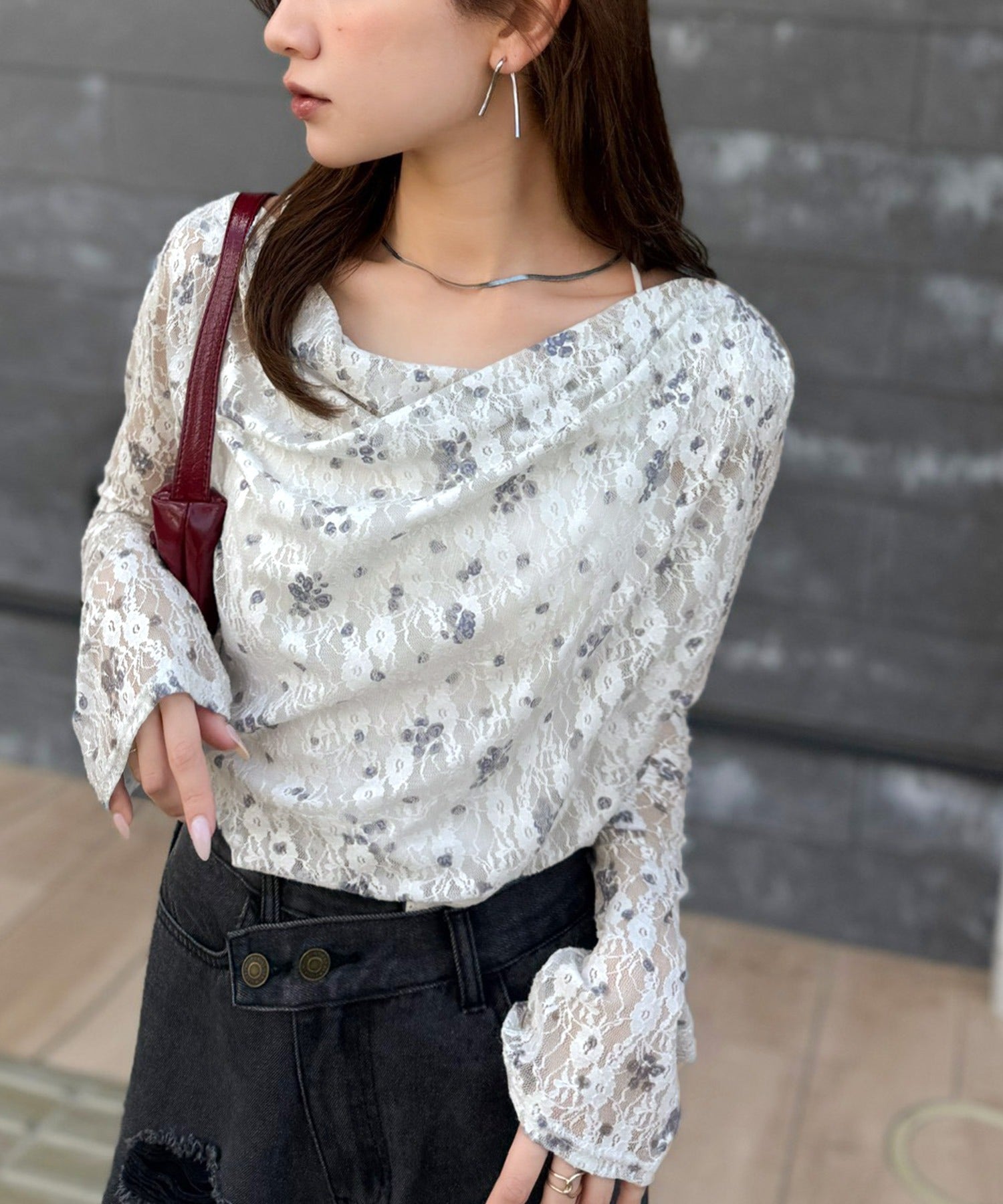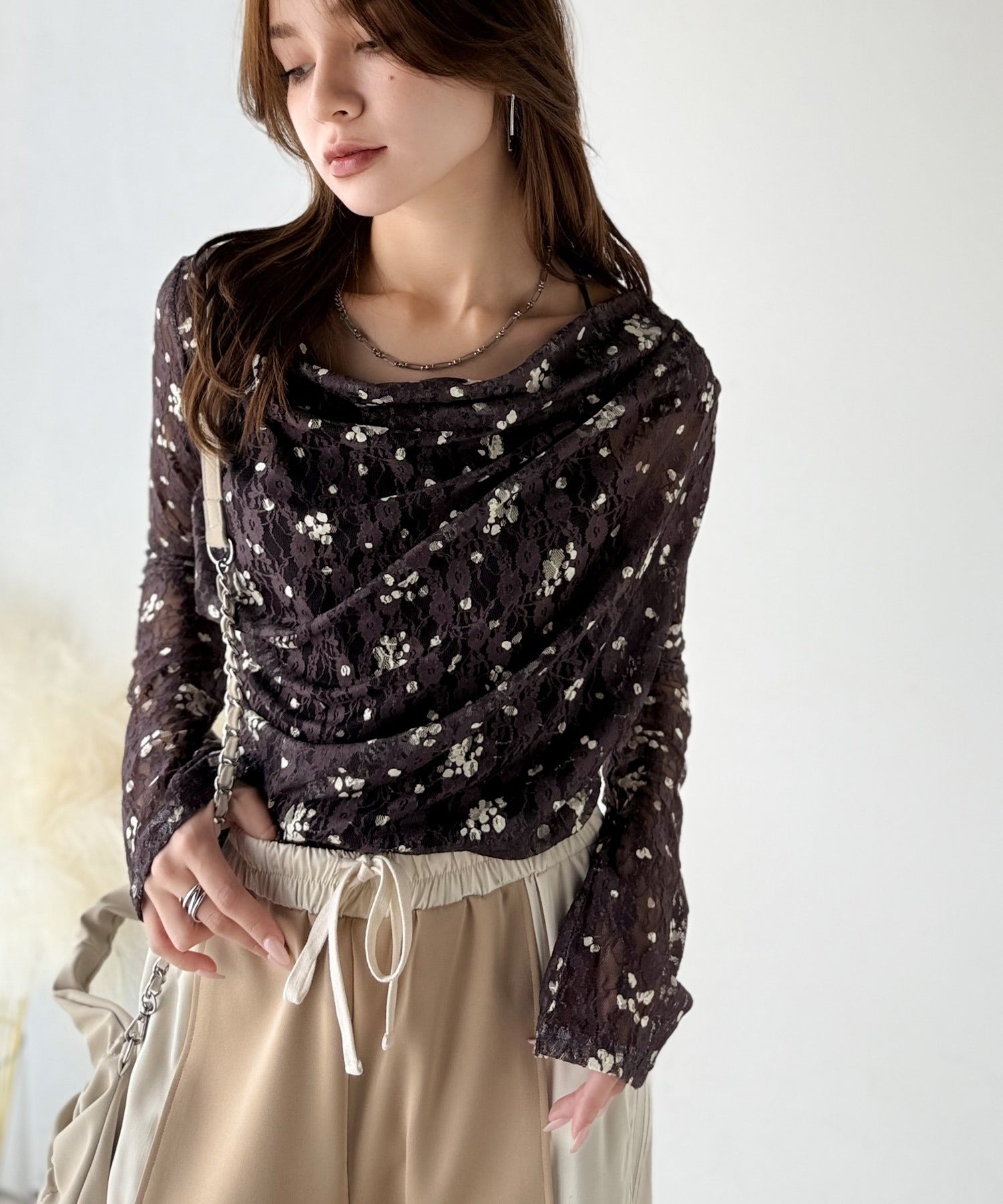 総柄レースがフェミニンな雰囲気を醸し出し、ドレープデザインで甘すぎない大人っぽさに◎
