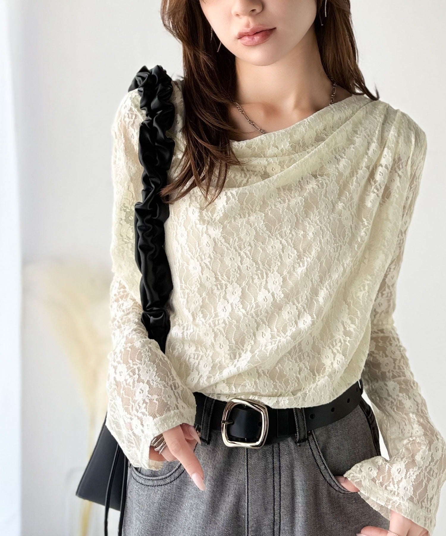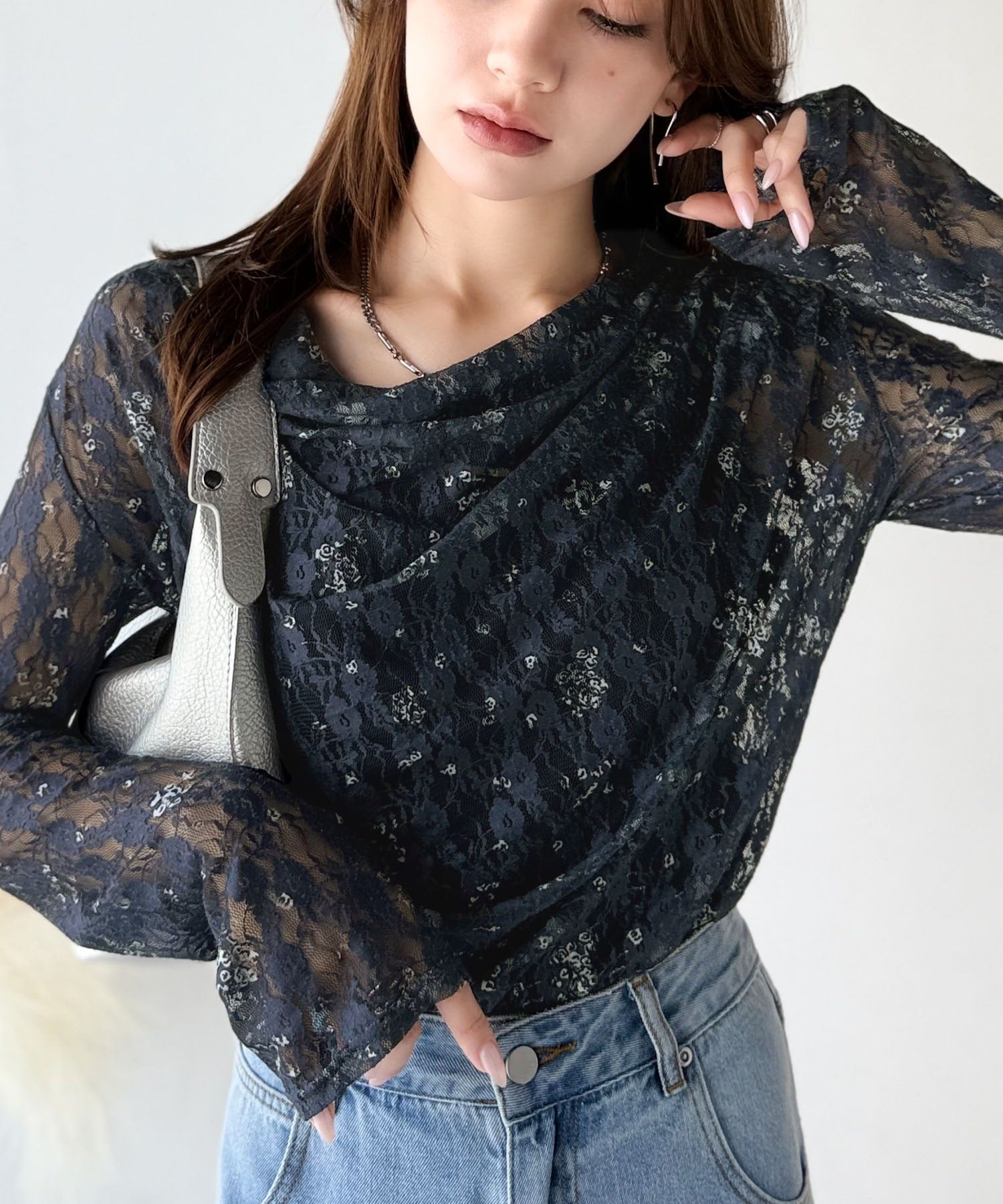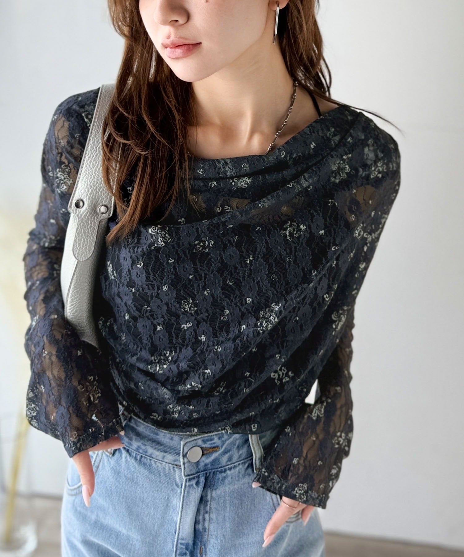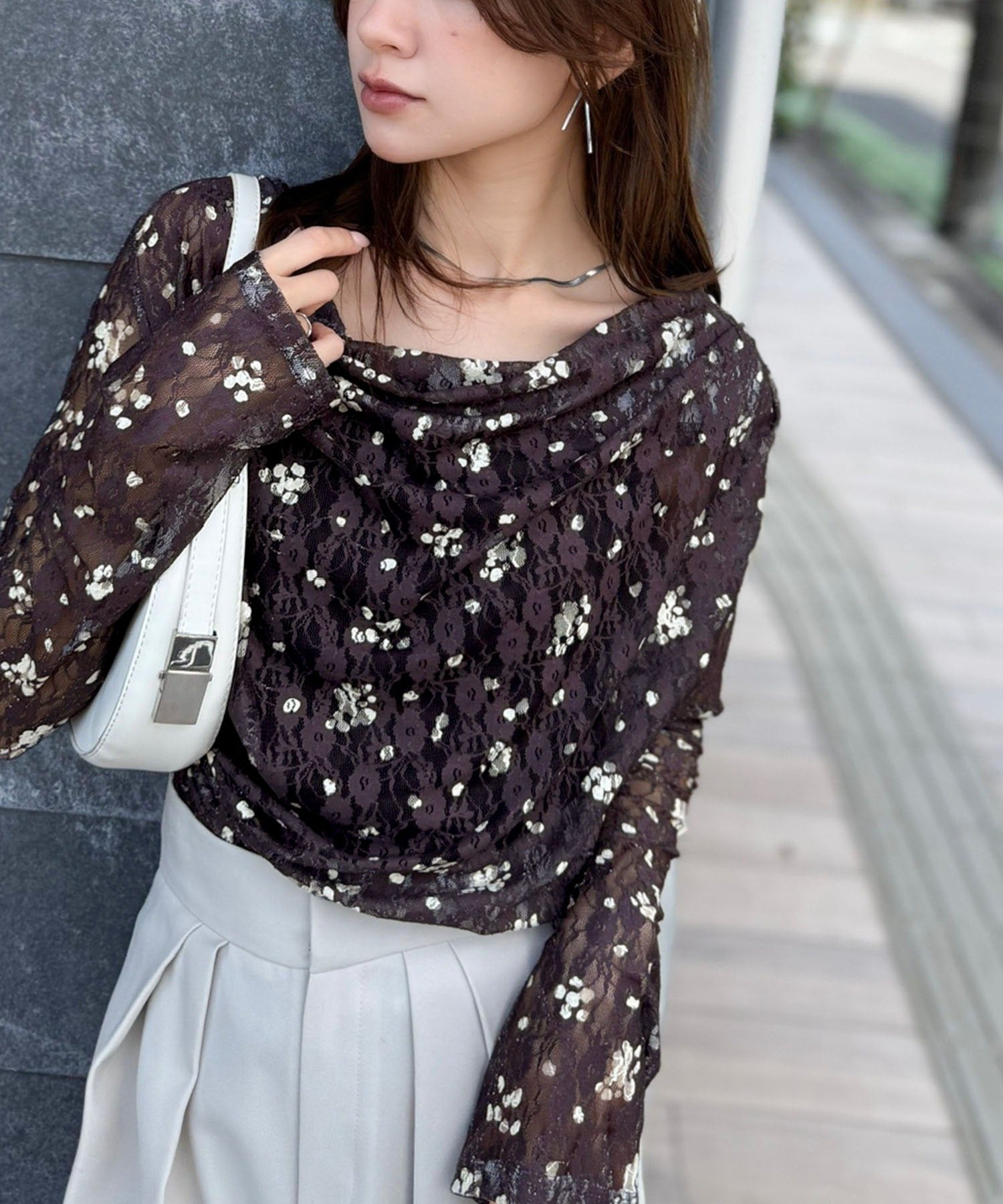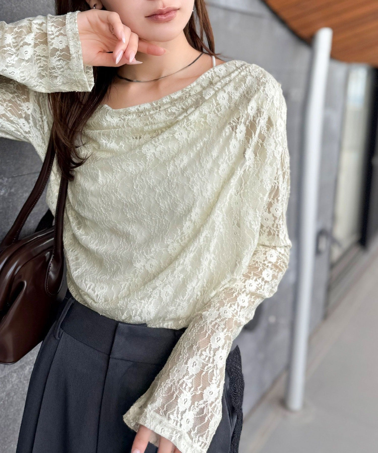 総柄レースがフェミニンな雰囲気を醸し出し、ドレープデザインで甘すぎない大人っぽさに◎