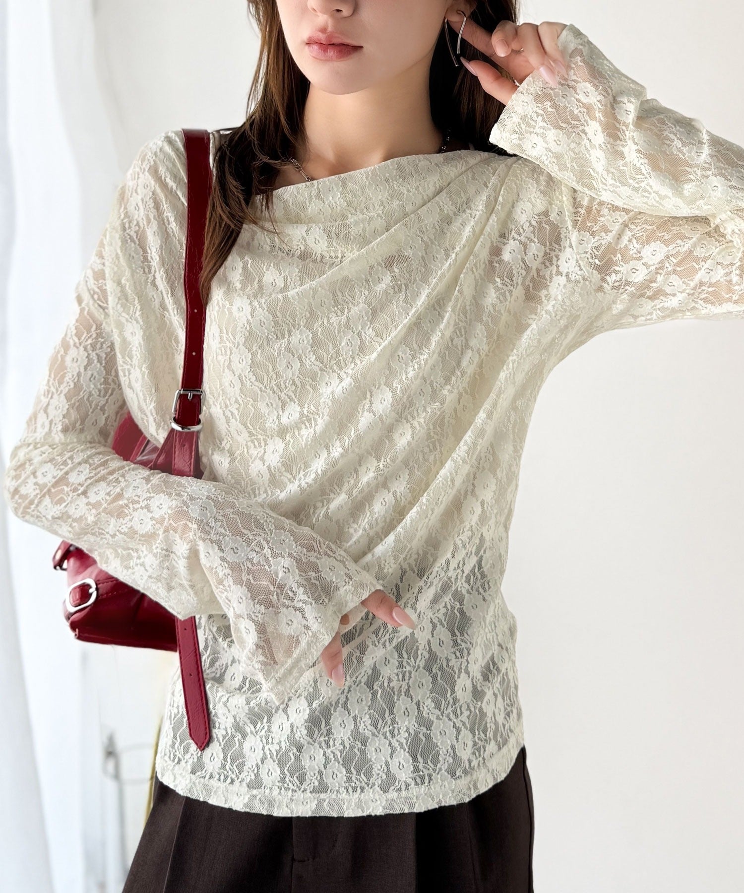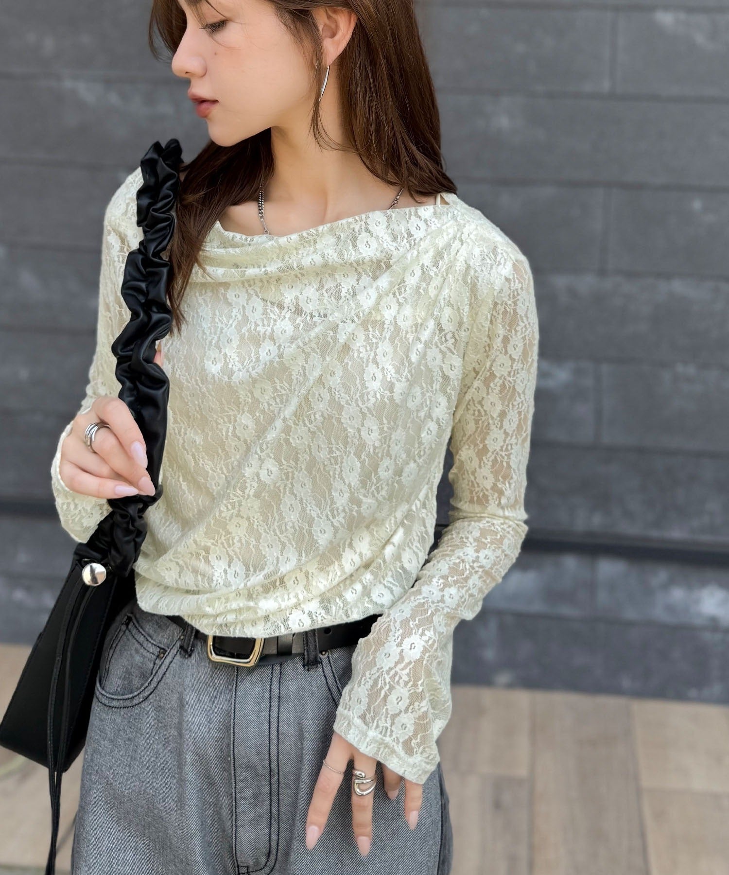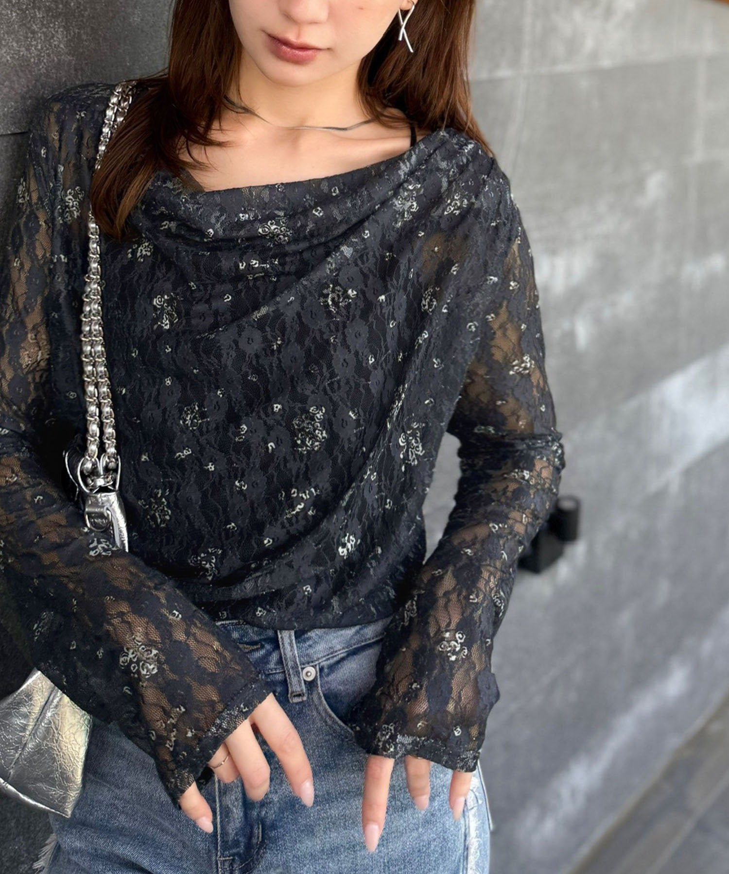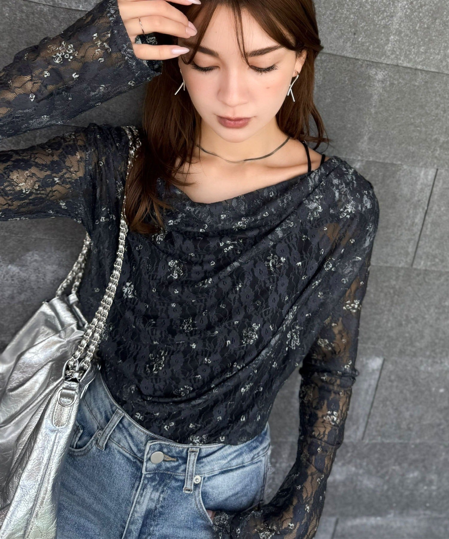 総柄レースがフェミニンな雰囲気を醸し出し、ドレープデザインで甘すぎない大人っぽさに◎
