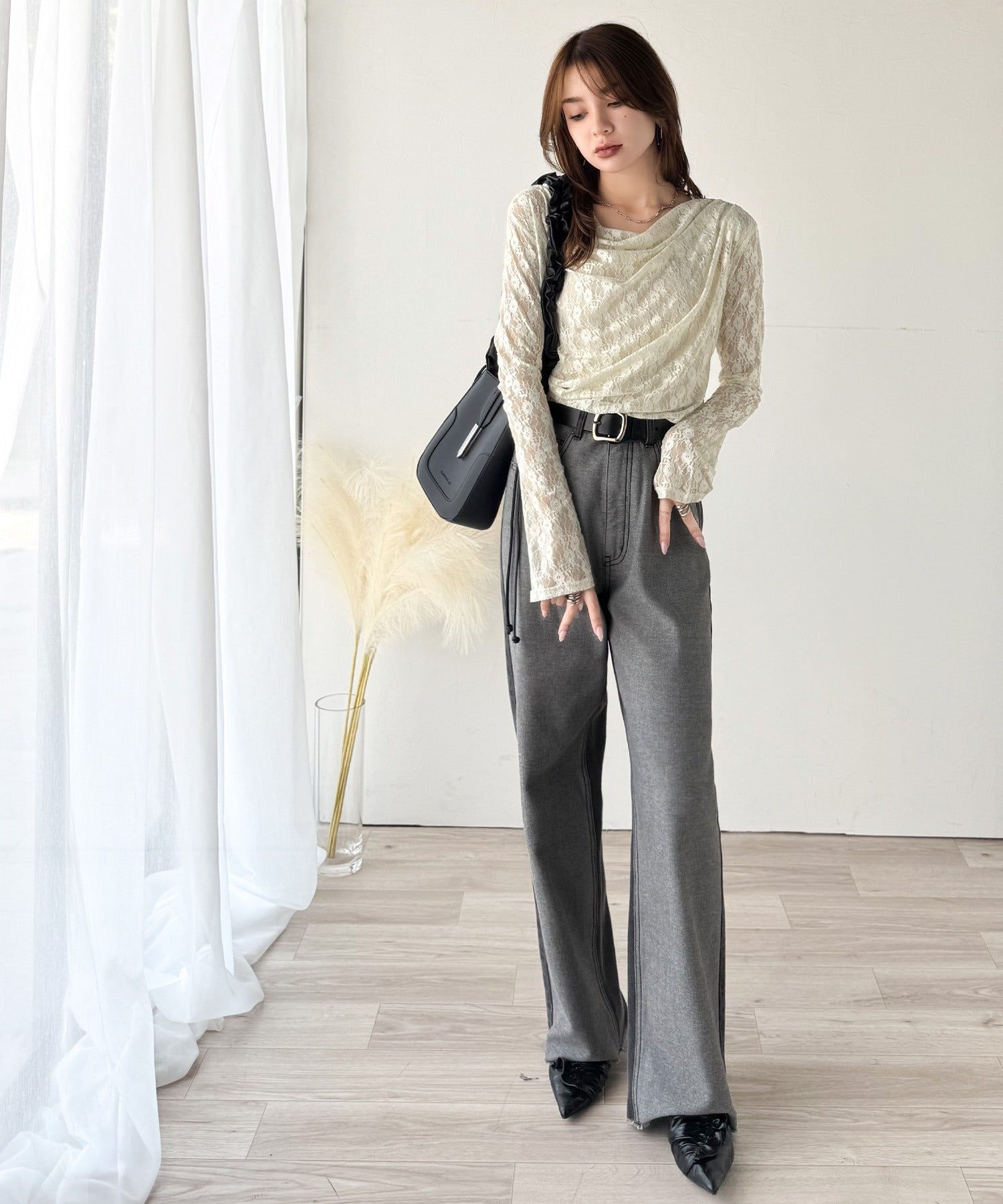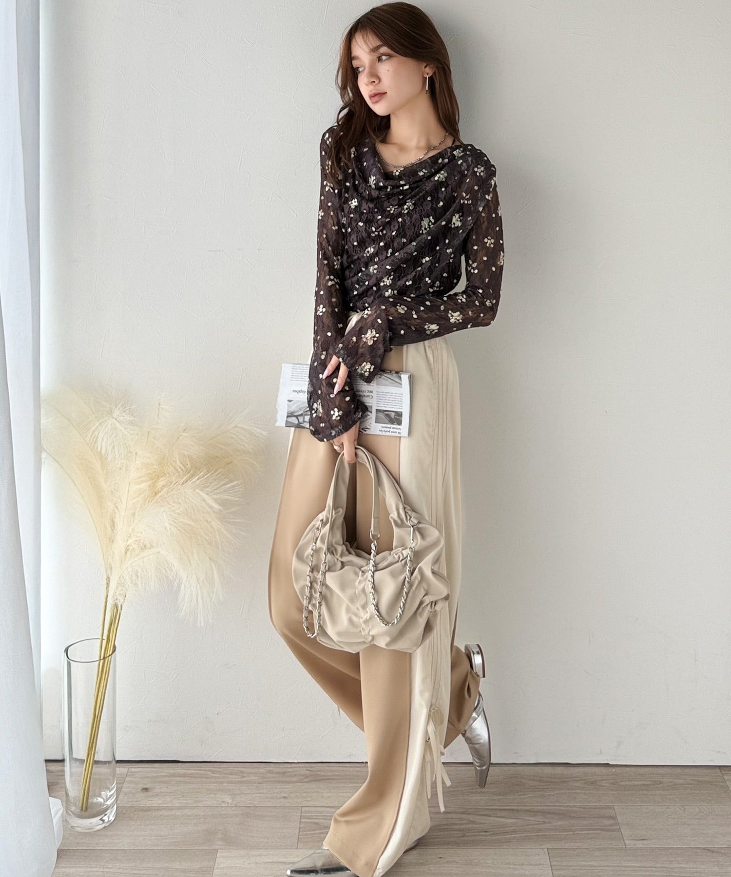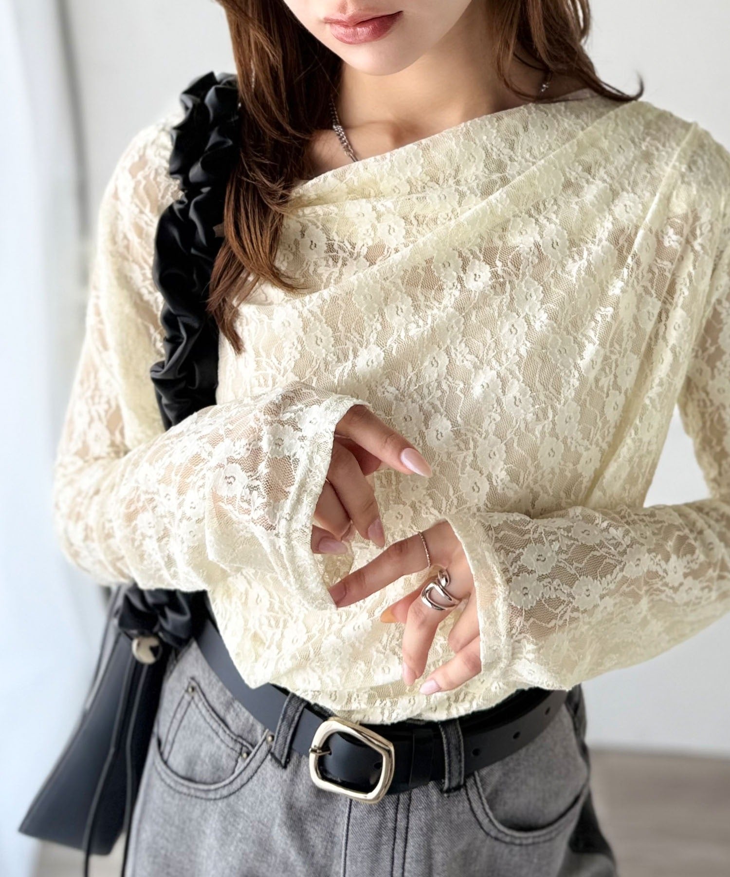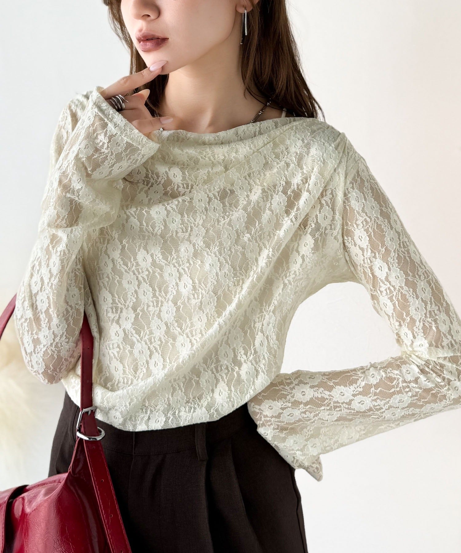 総柄レースがフェミニンな雰囲気を醸し出し、ドレープデザインで甘すぎない大人っぽさに◎