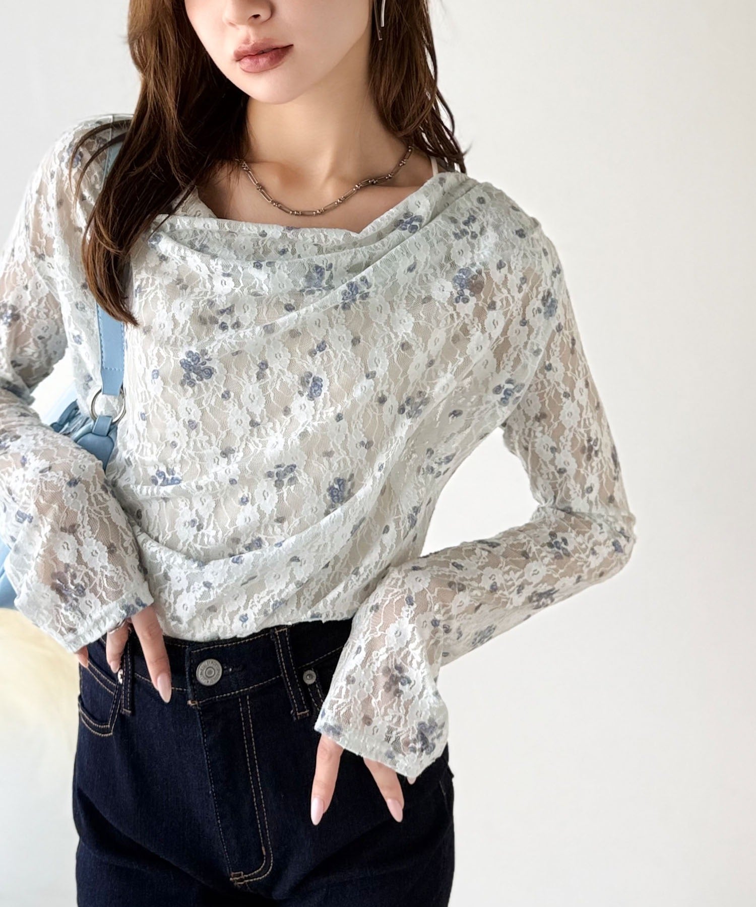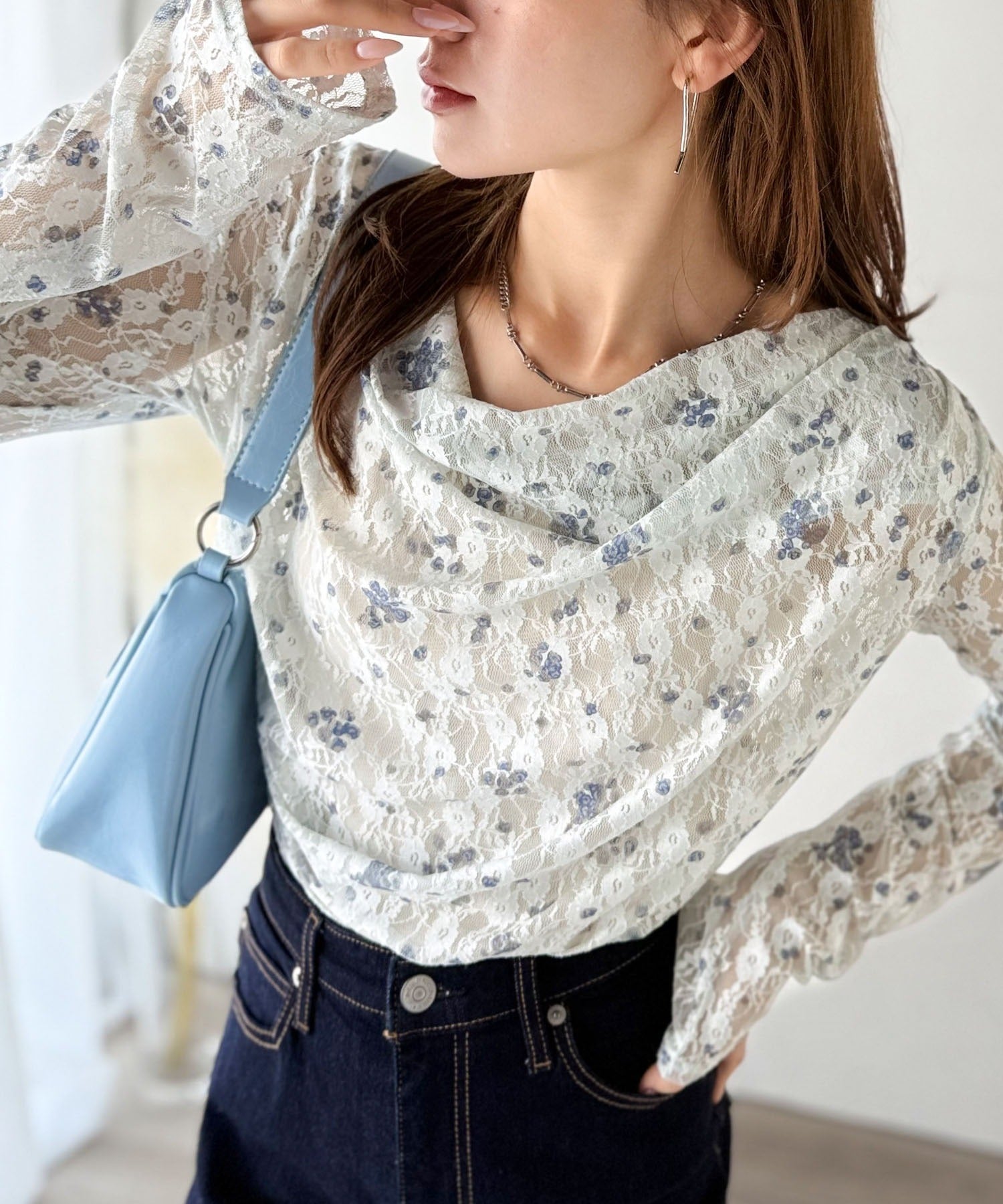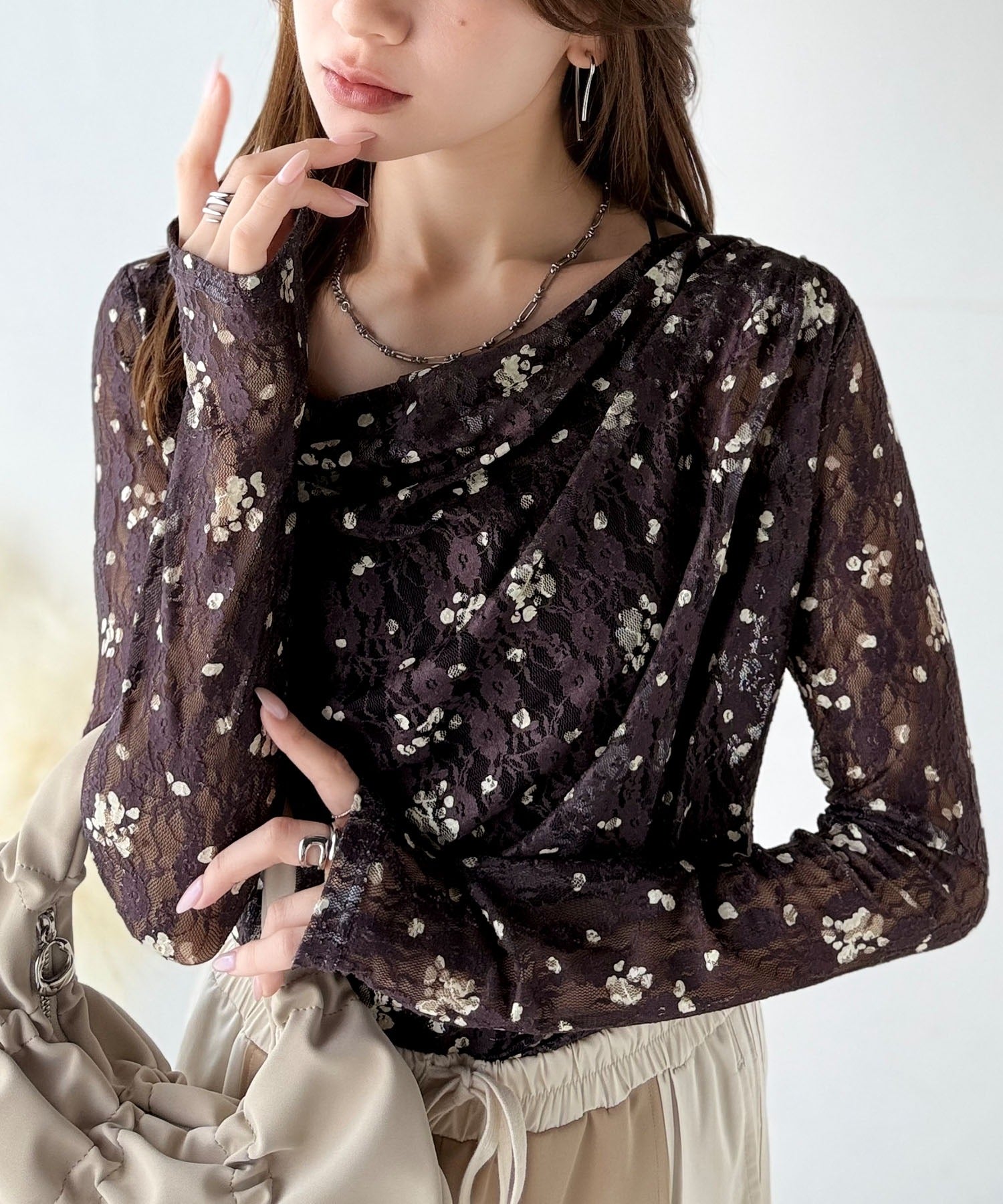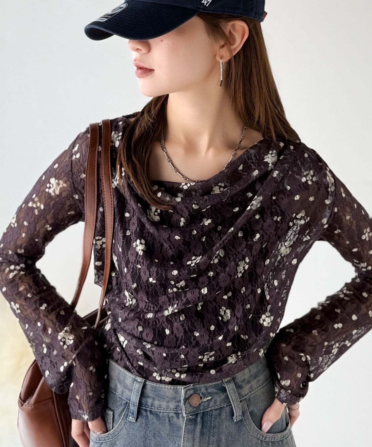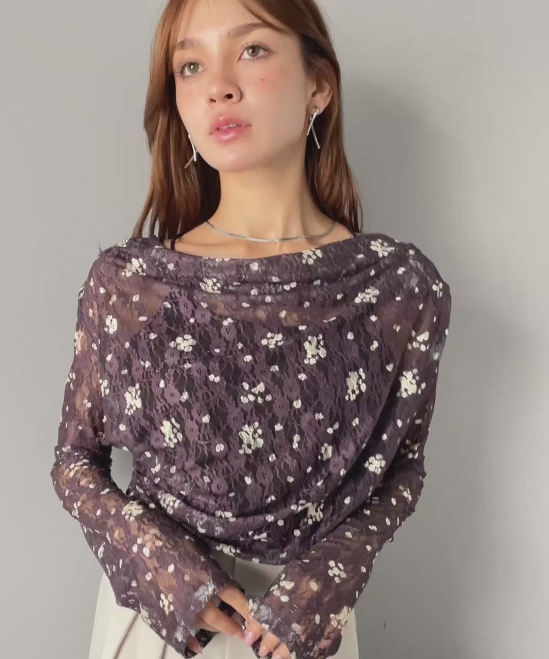 花柄の総レースが視覚的に華やかさをプラスしてくれるトレンド感のあるトップスです。