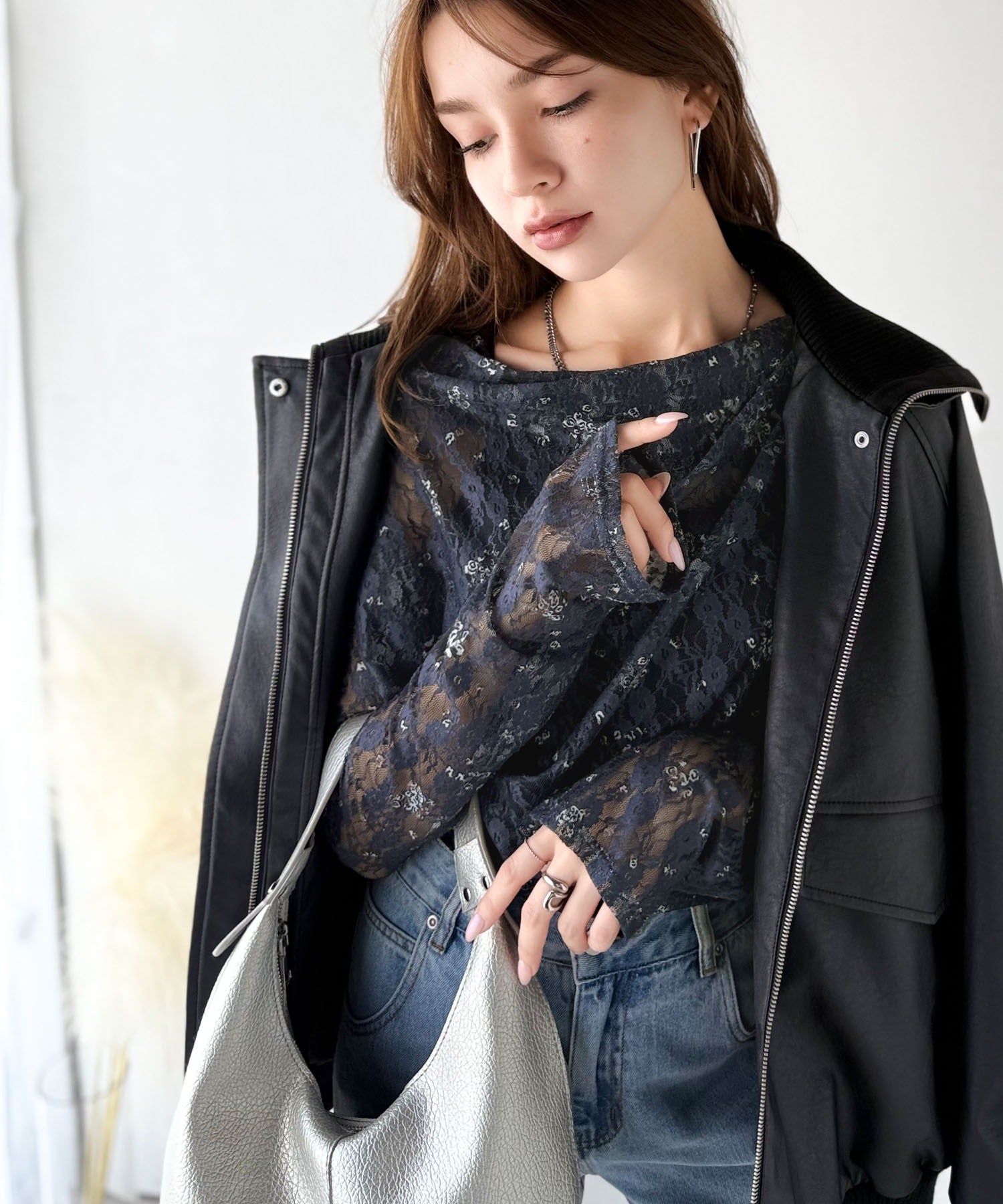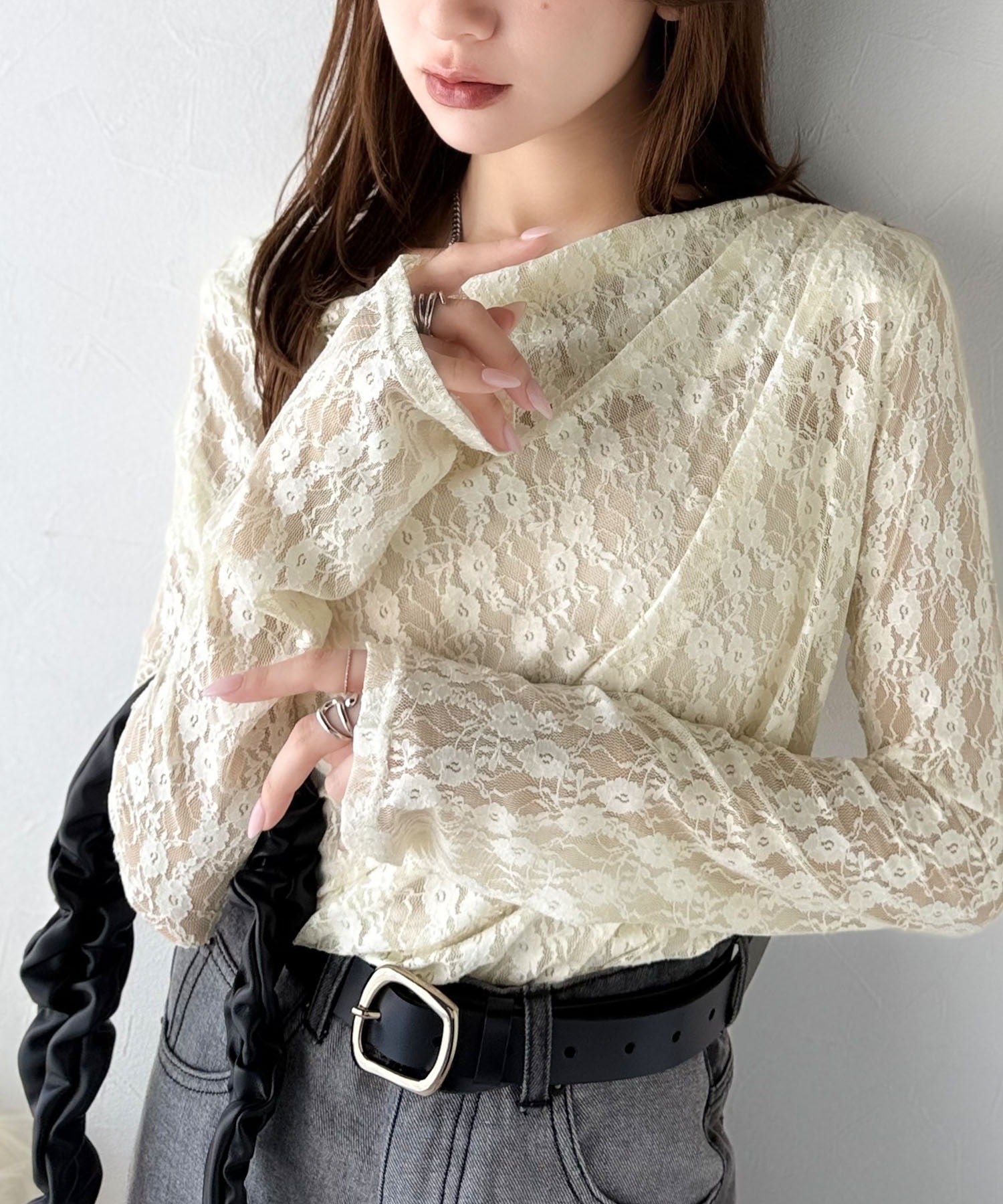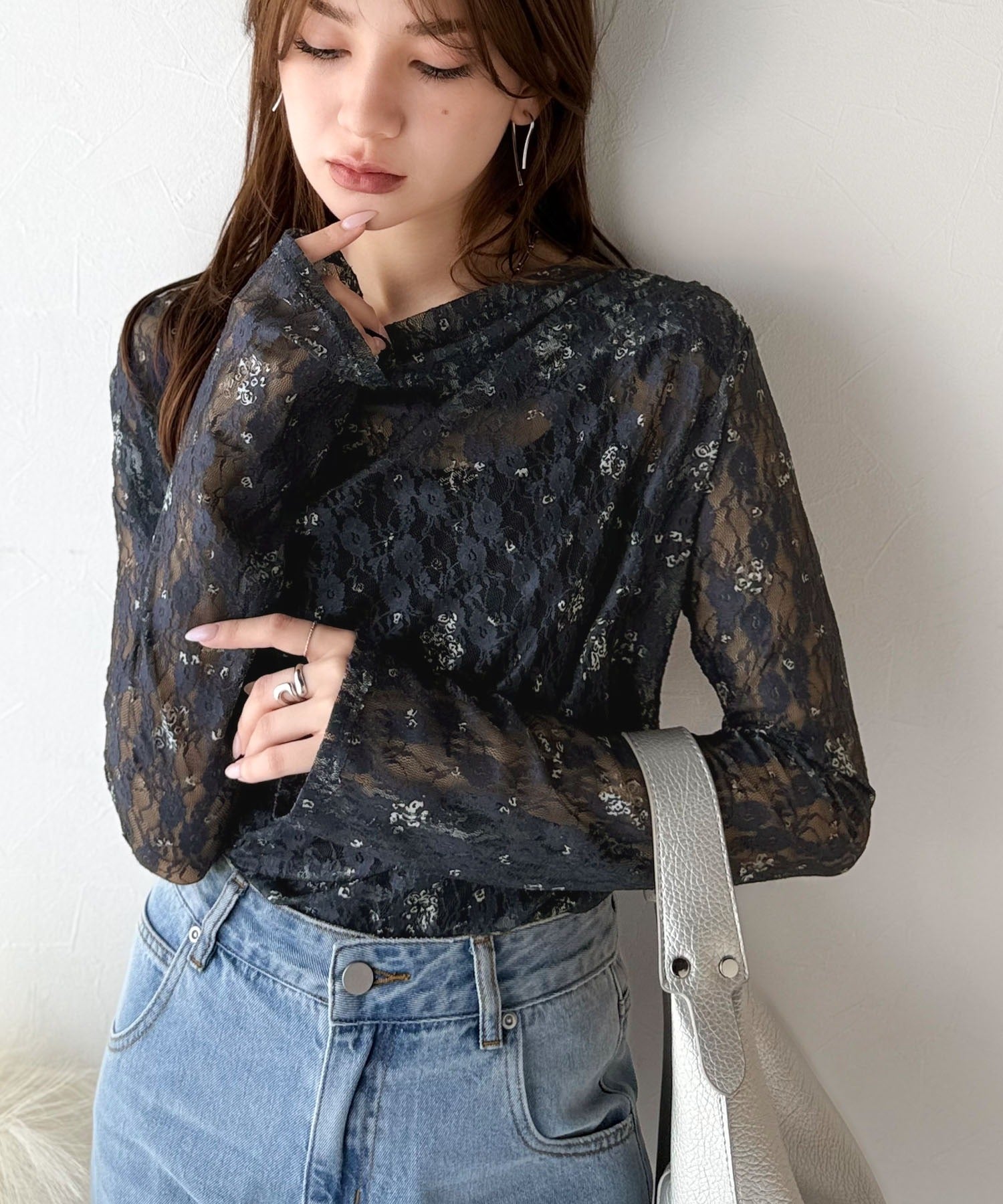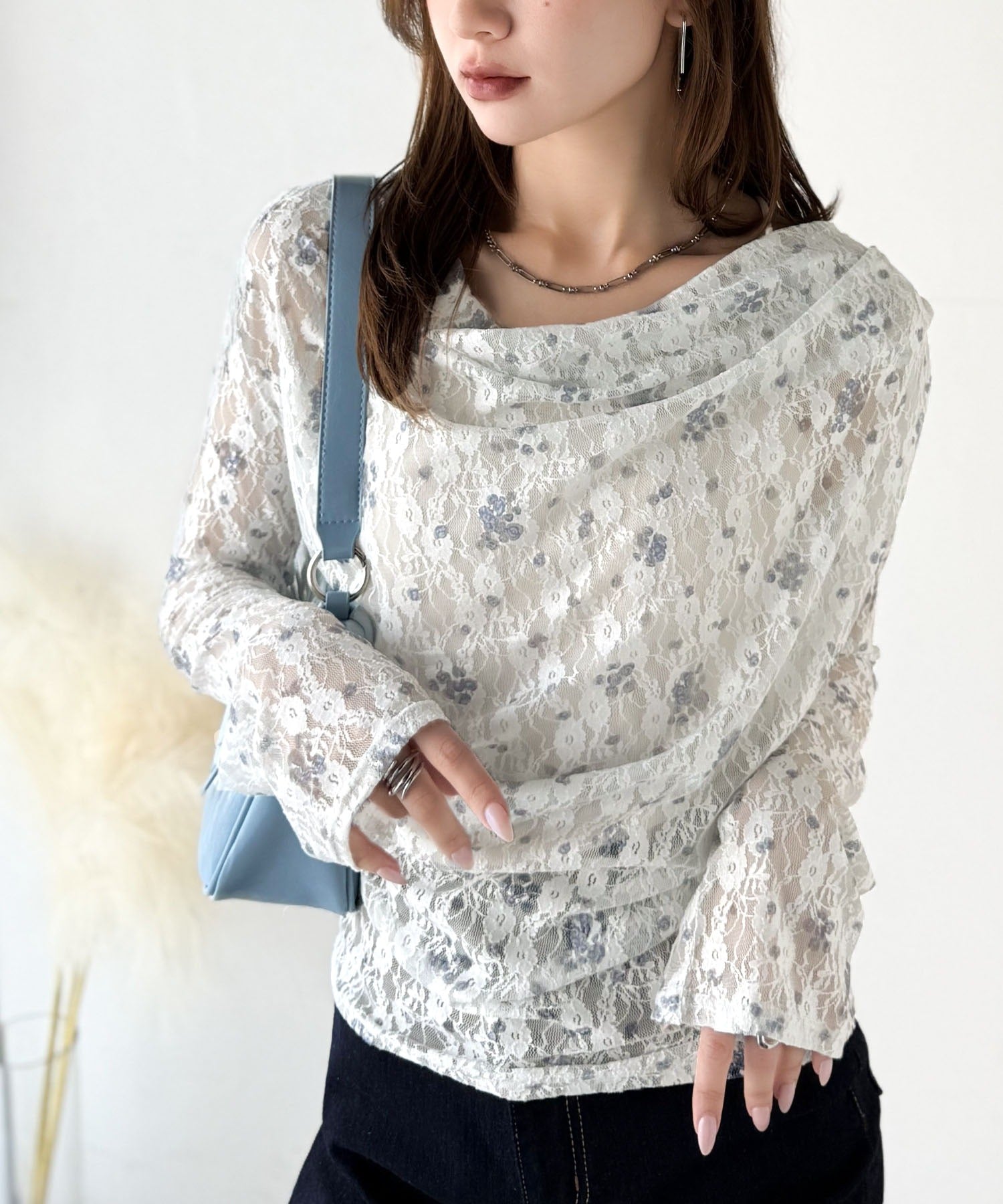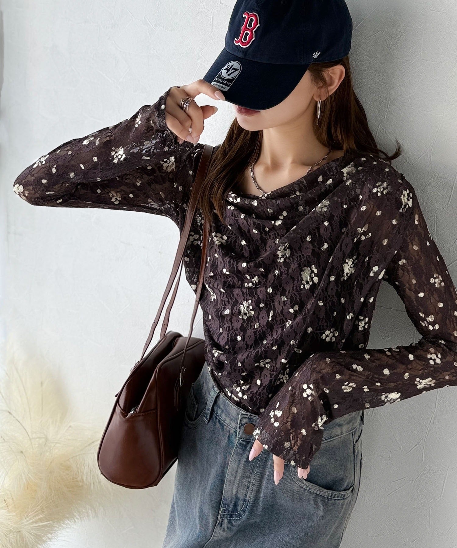 花柄の総レースが視覚的に華やかさをプラスしてくれるトレンド感のあるトップスです。