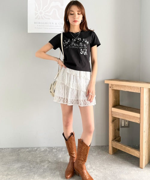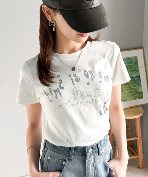 【mily bilet】大人の上品グラフティ。ハンドペイントライクシルバープリントコンパクトTシャツ mi1329023