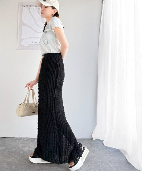 きれいめなスタイルでは、ワイドパンツやプリーツスカートに合わせて、