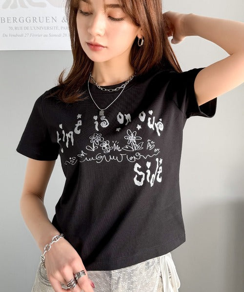 シルバーのグラフティプリントが目を引く、コンパクトサイズのTシャツ。