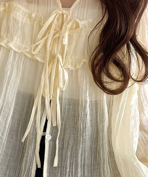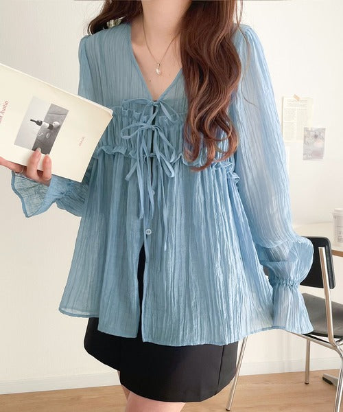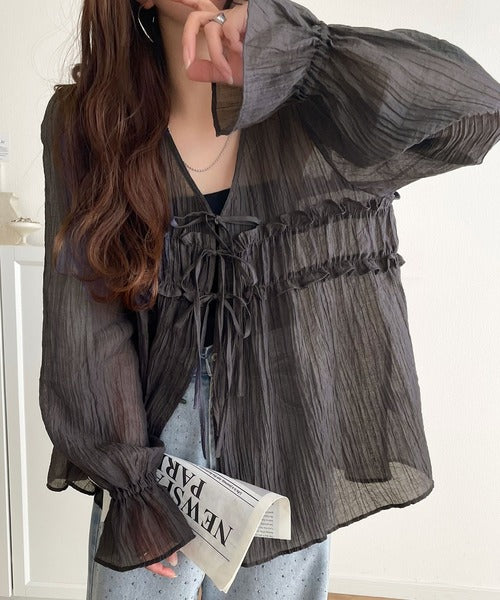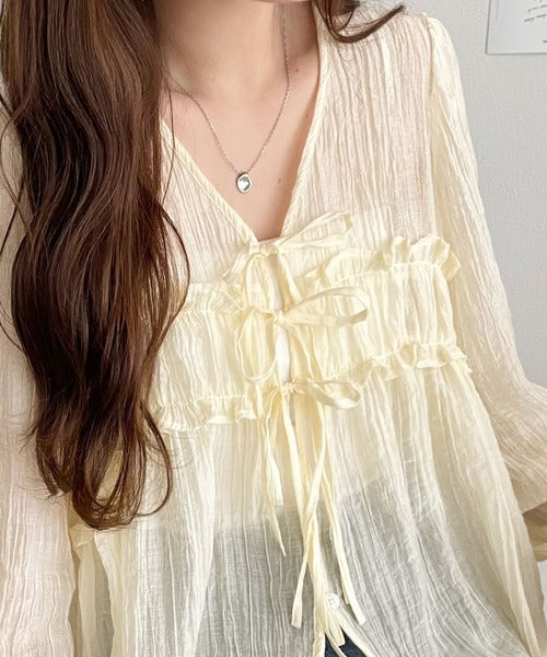 フロントのリボンが可愛らしいシアートップス。