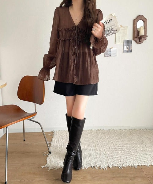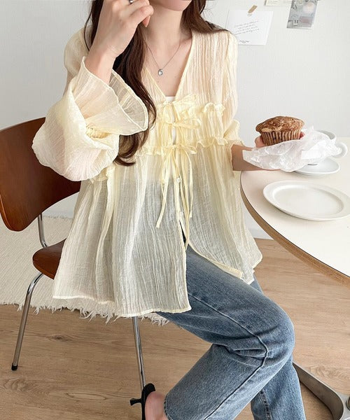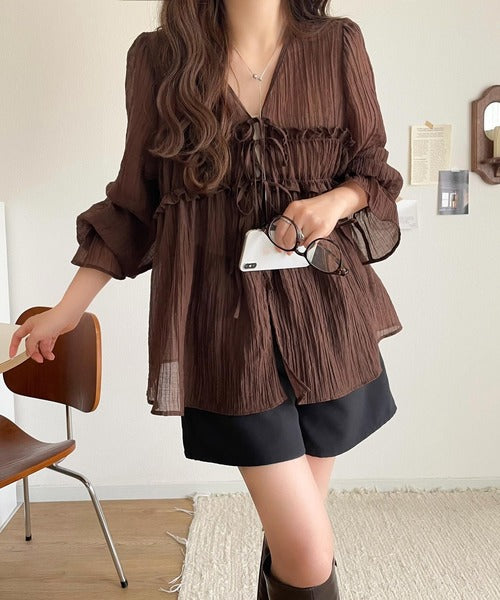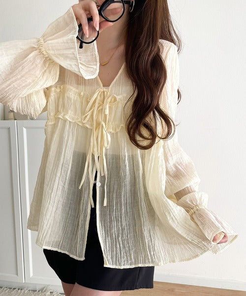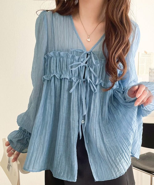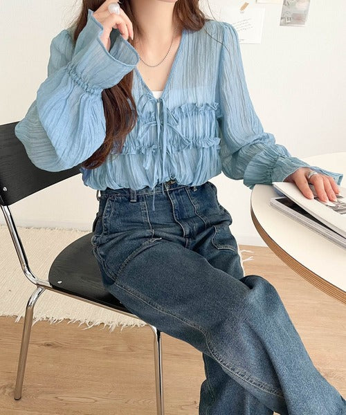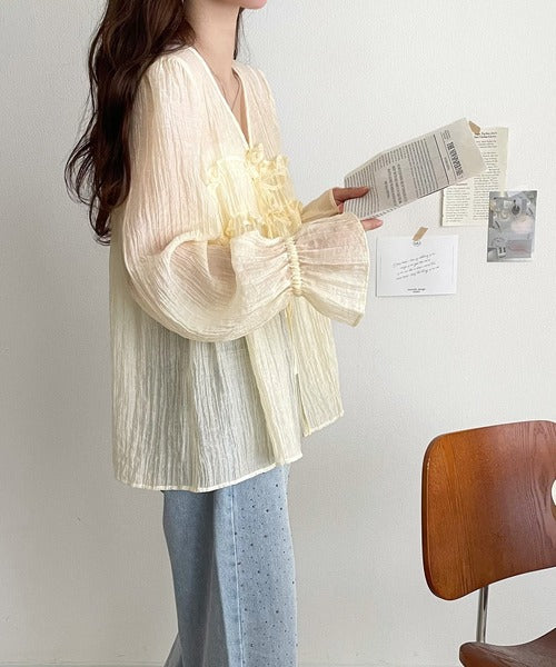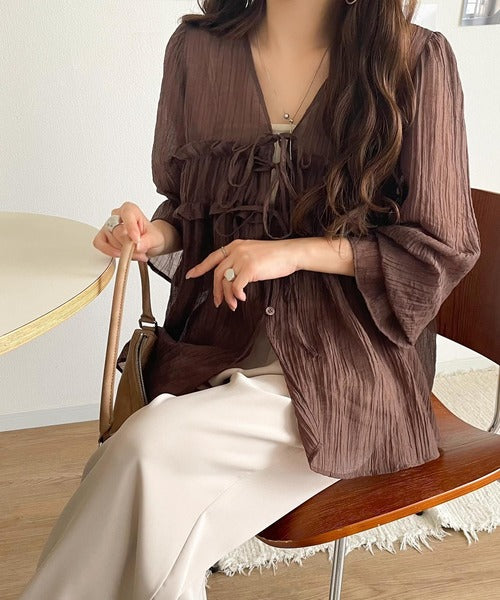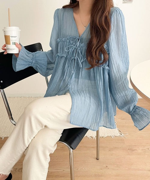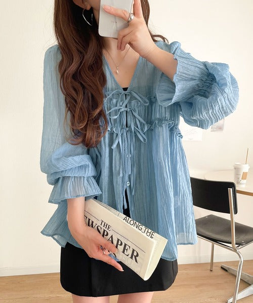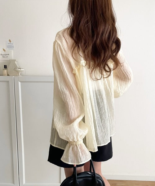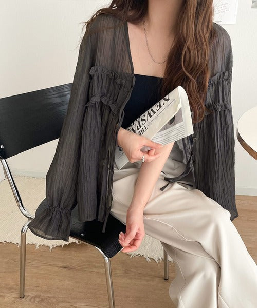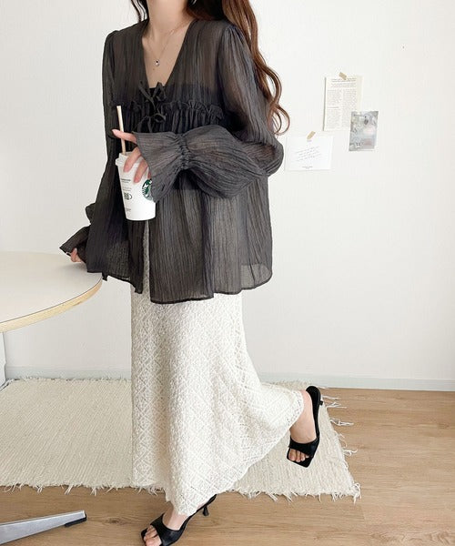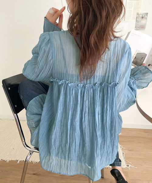 ふんわりとしたシルエットを引き立てるシアー素材のブラウス。