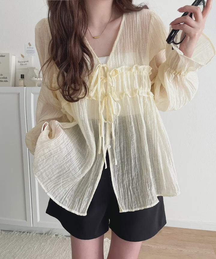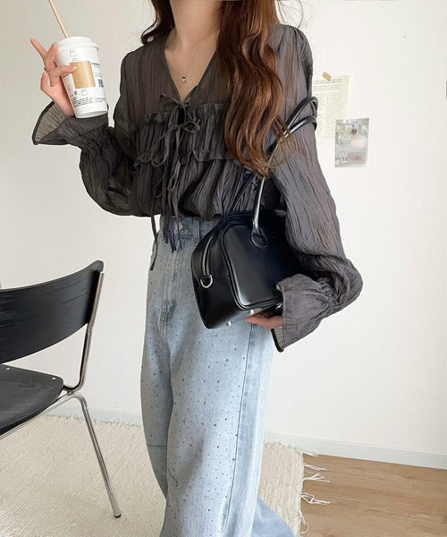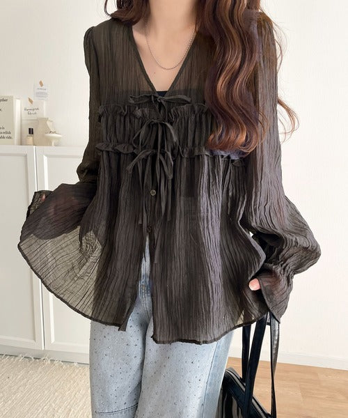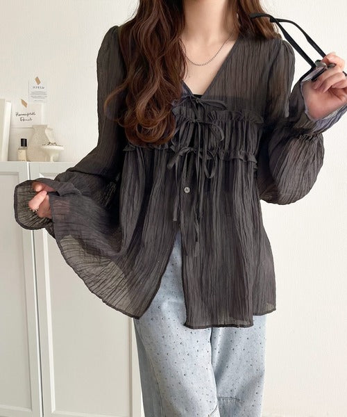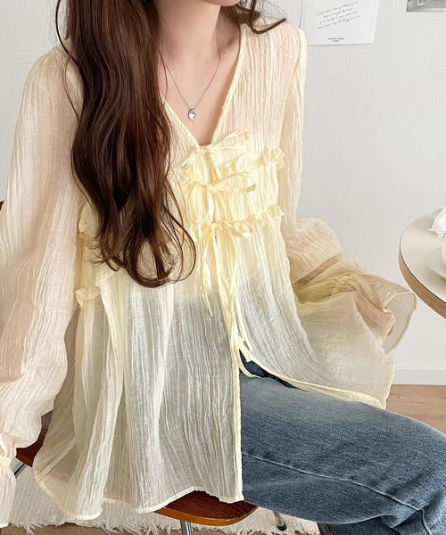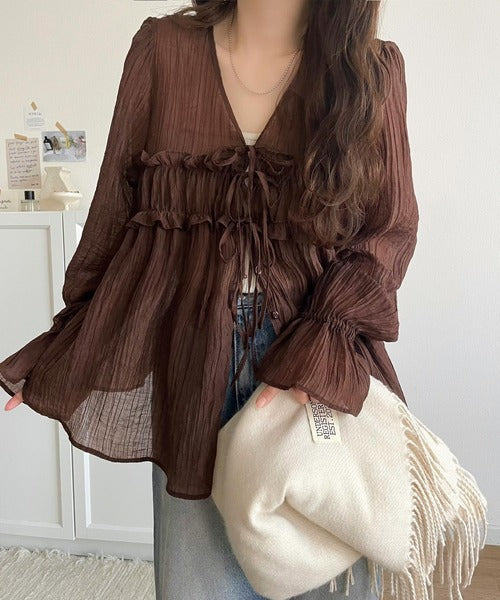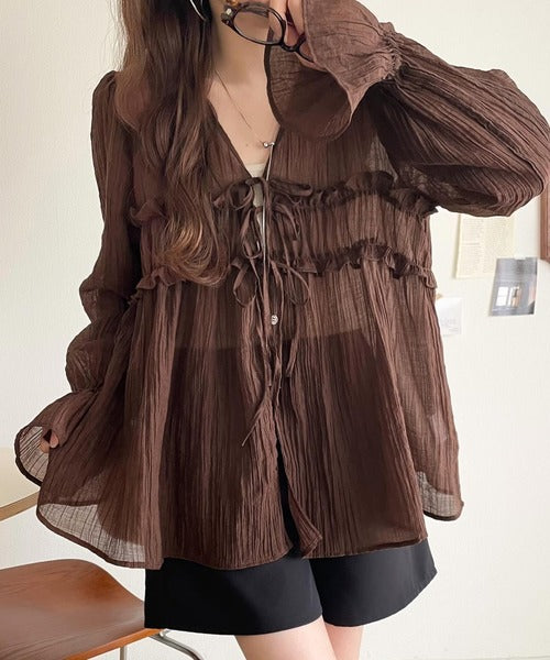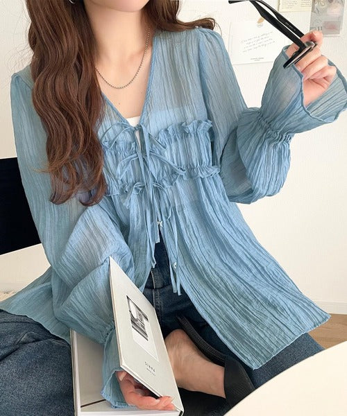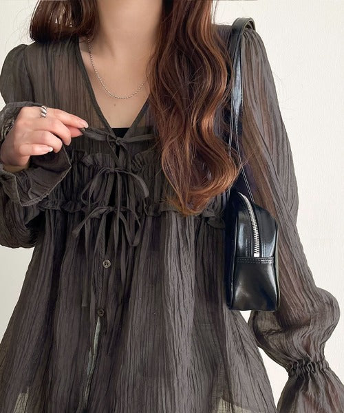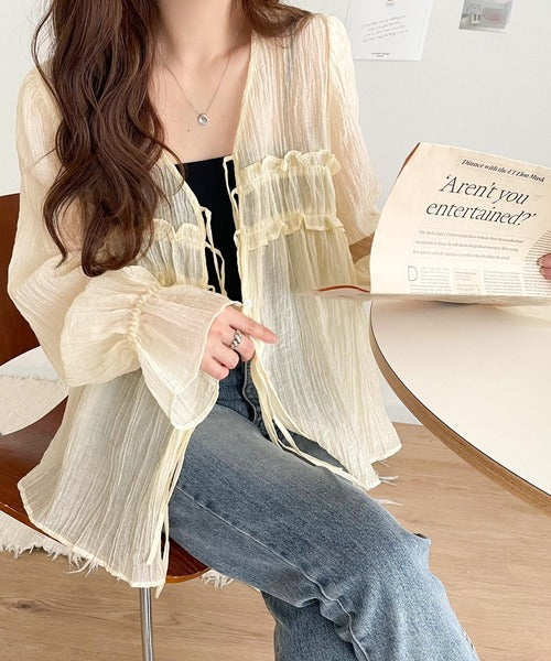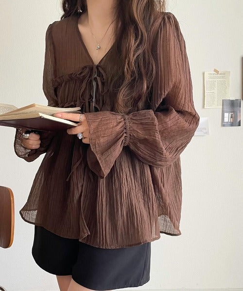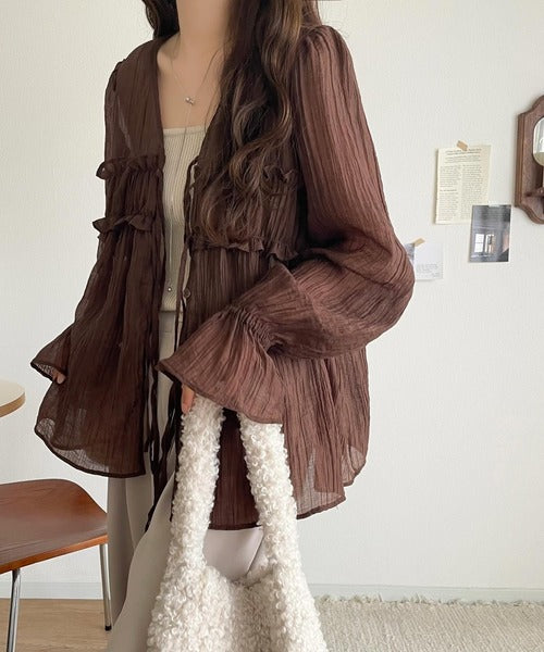 ふんわりとしたシルエットを引き立てるシアー素材のブラウス。