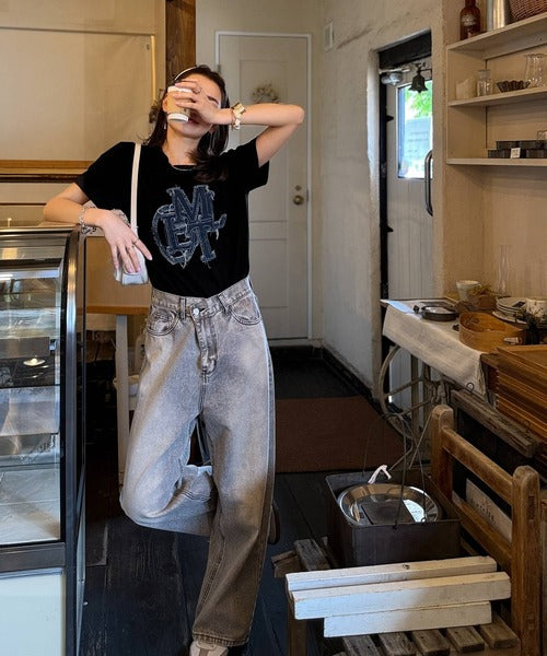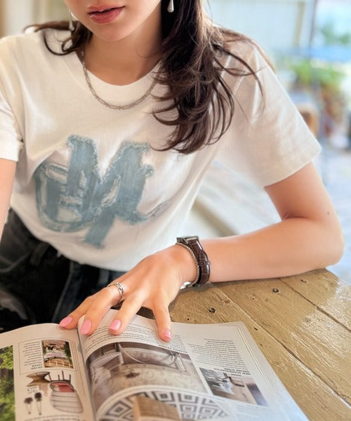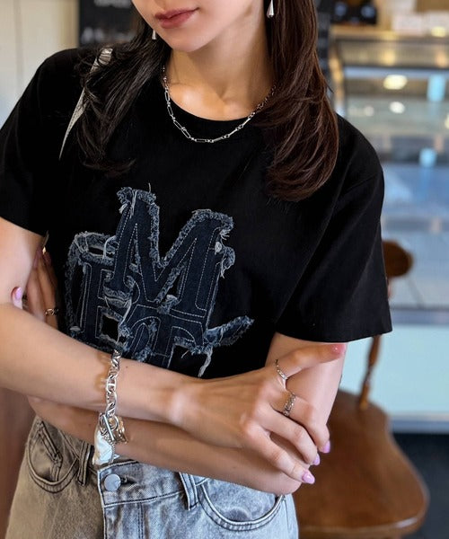 トレンド感たっぷりのダメージ加工が施されたロゴワッペンがインパクトのあるTシャツ。