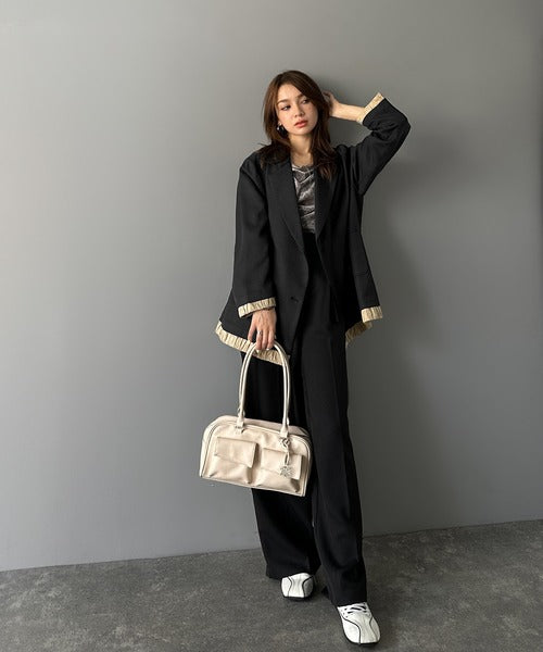 【素材】 【ベージュ、ブラウン、ブラック】表地:ポリエステル100% 裏地:ポリエステル100% 別布:綿64%、ポリエステル36% 【チャコールストライプ】表地:ポリエステル97%、レーヨン3% 裏地:ポリエステル100% 別布:綿64%、ポリエステル36%