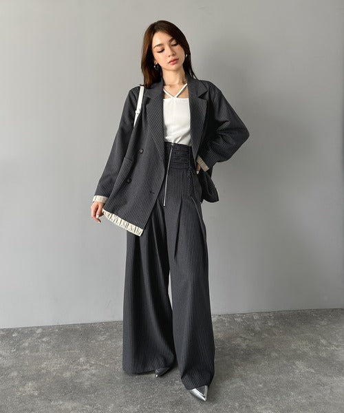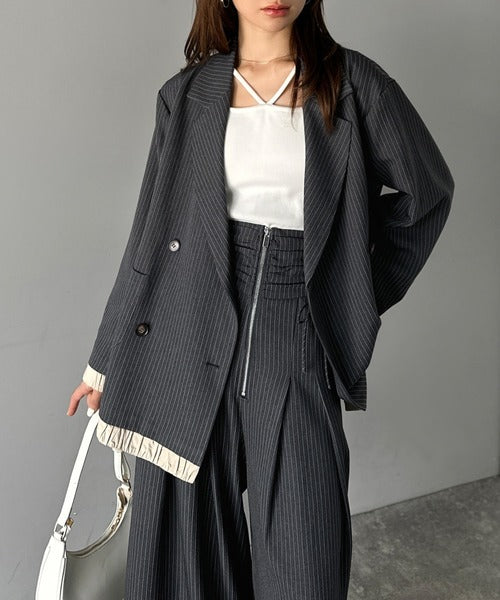 トレンド感を出したい時は、シアートップスを使ったレイヤードスタイルにジャケットを羽織ることで、上品さとヌケ感を演出します♪