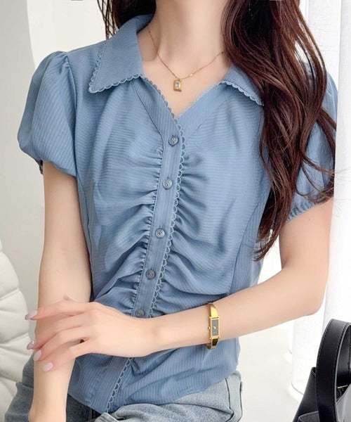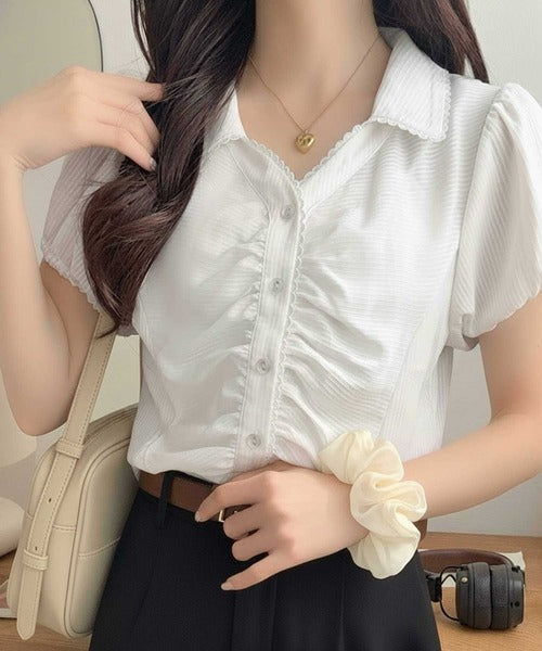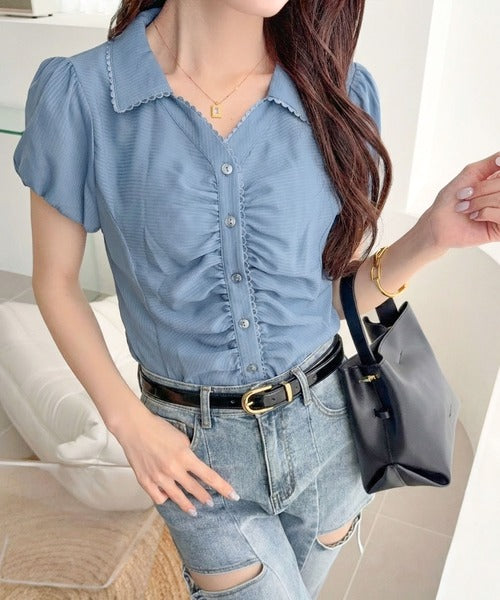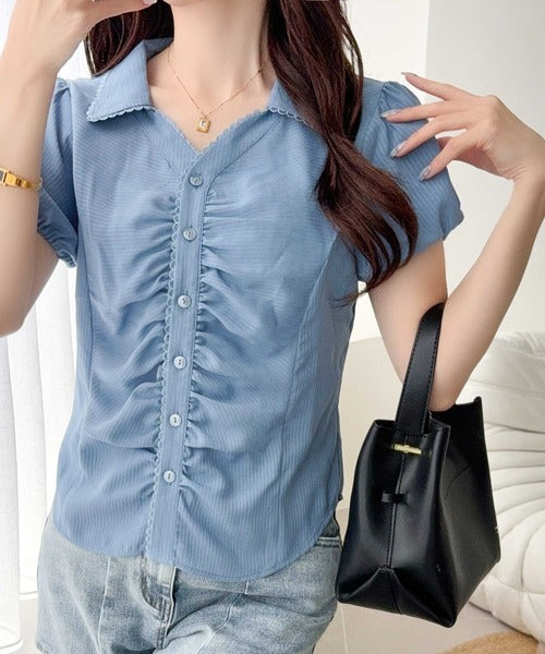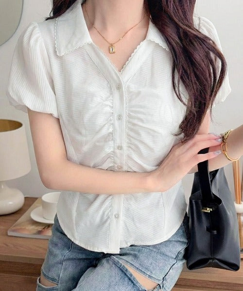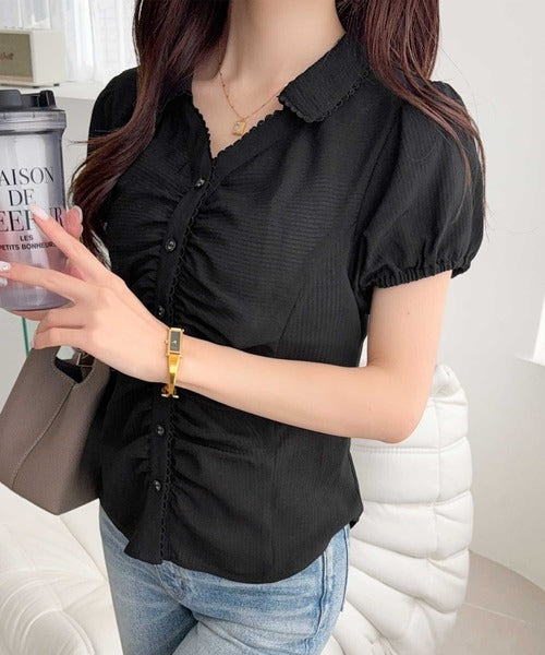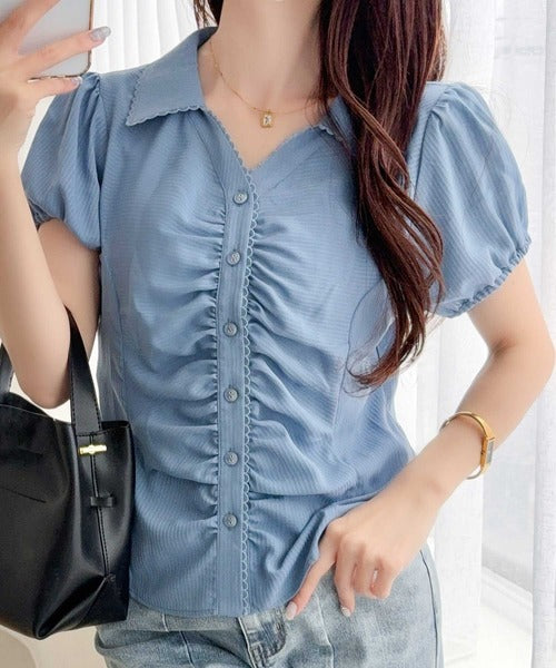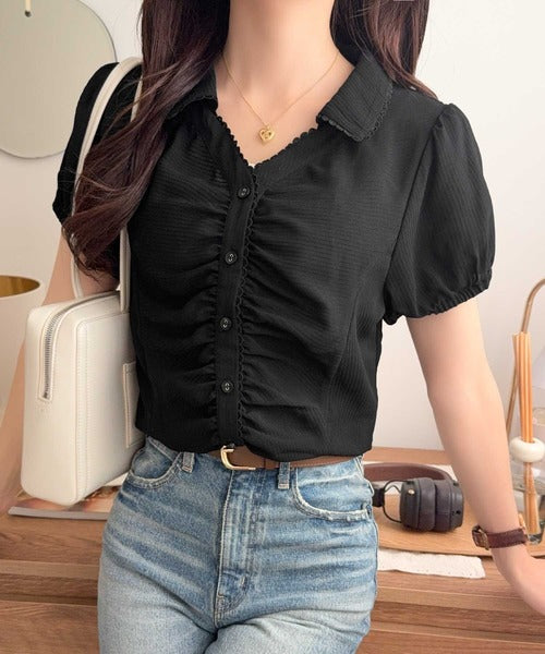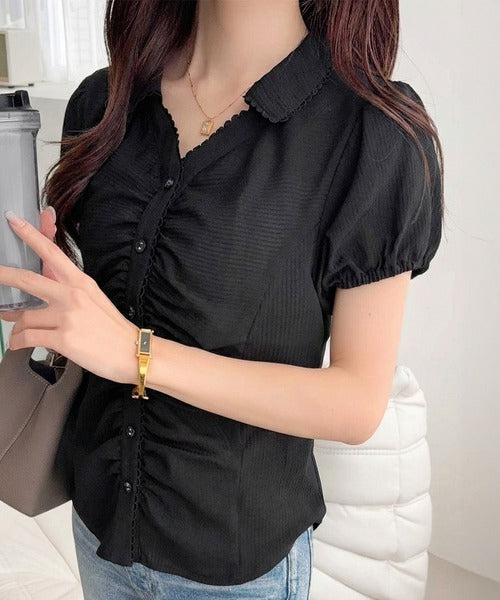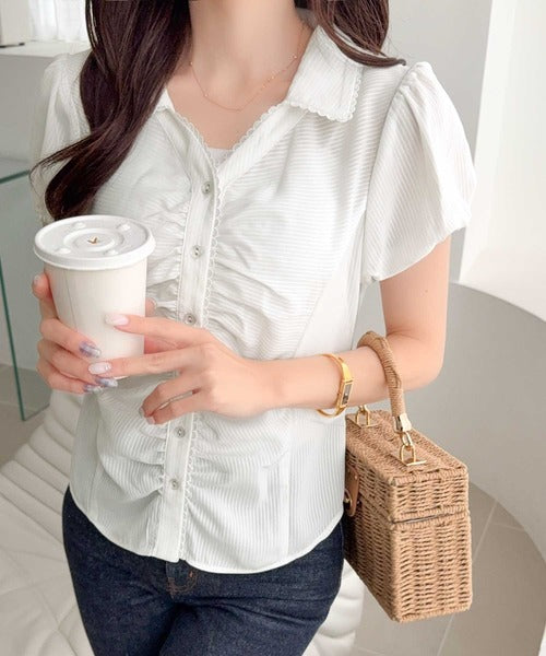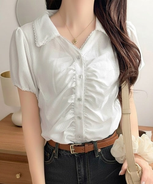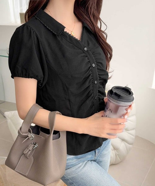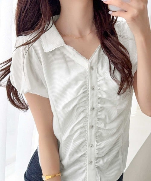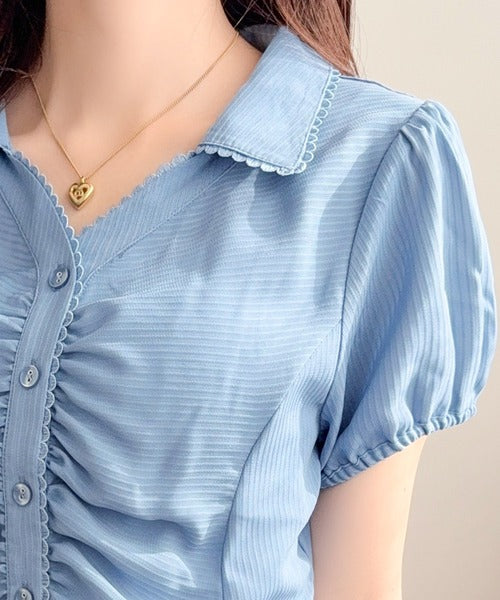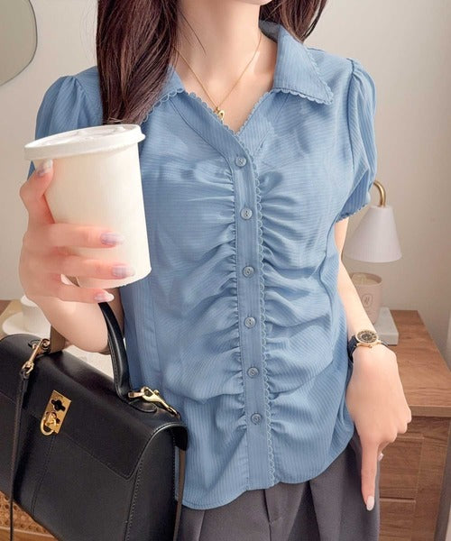 【mily bilet】ふんわりシアーが作る透明感。襟付きピコレースギャザーブラウス(半袖) mi1329077