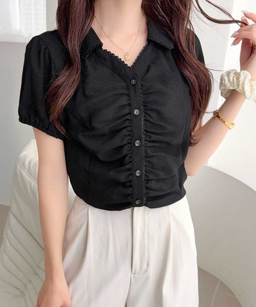 フェミニンを引き立てるコンパクトギャザーブラウス◎