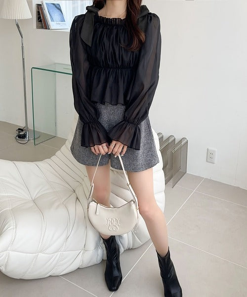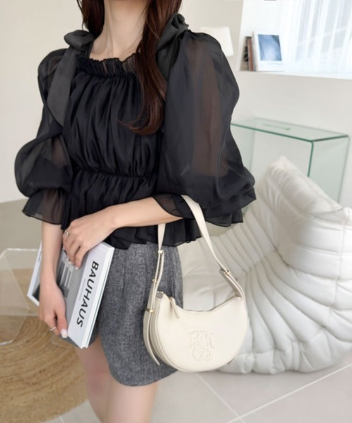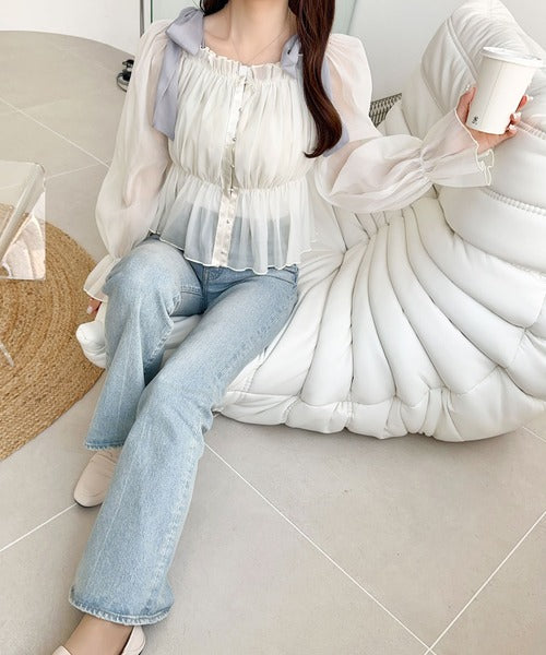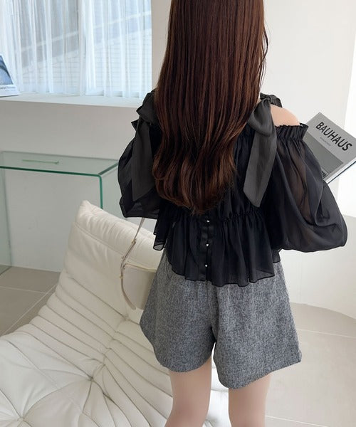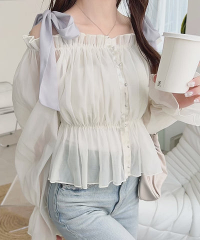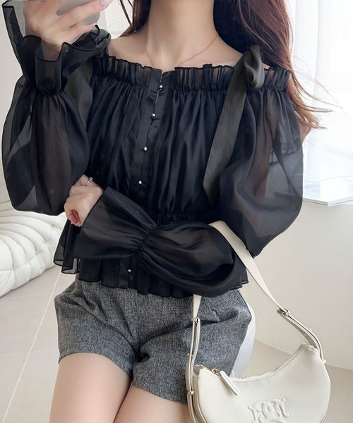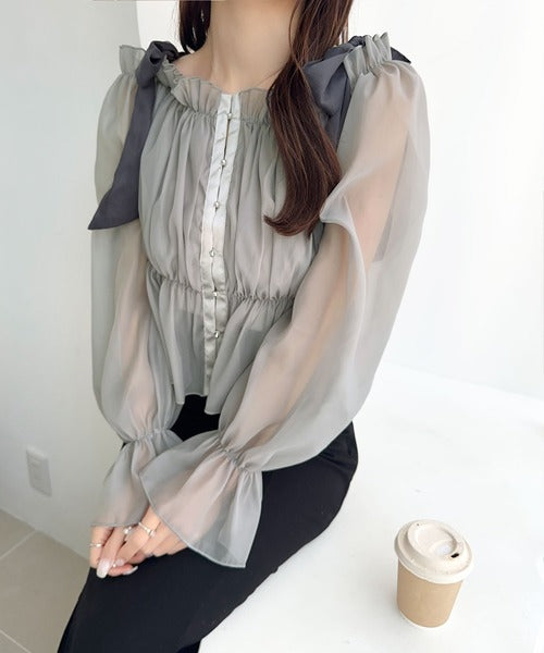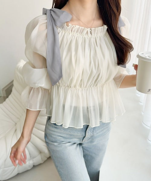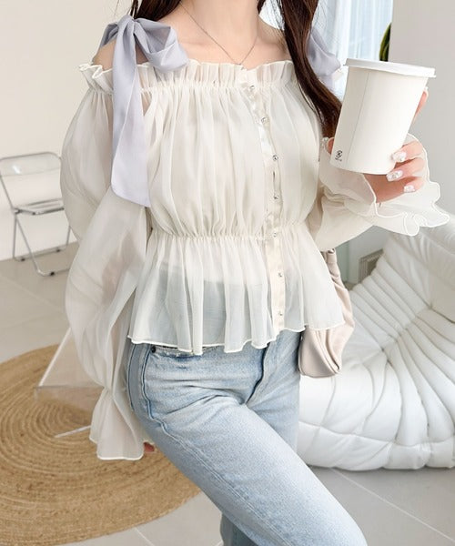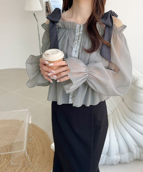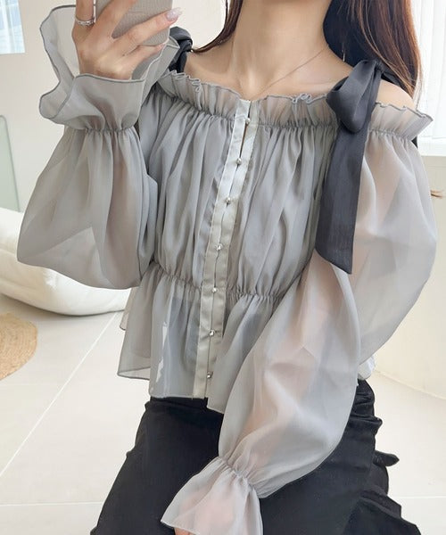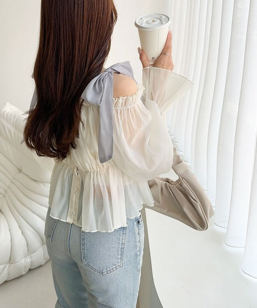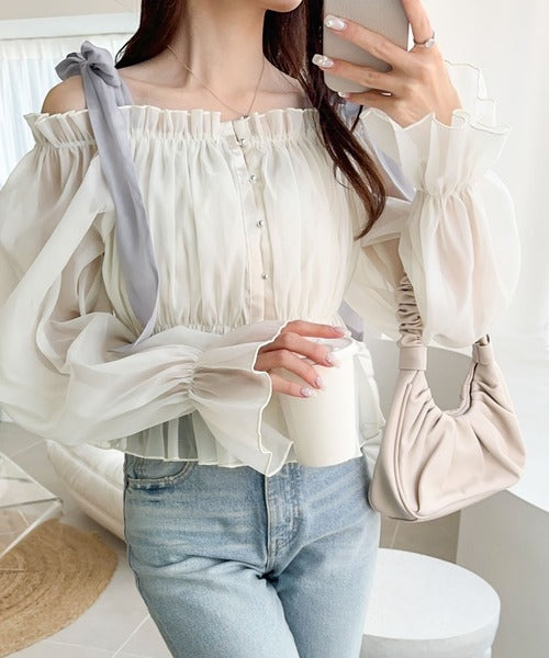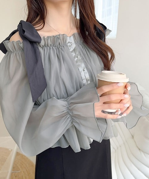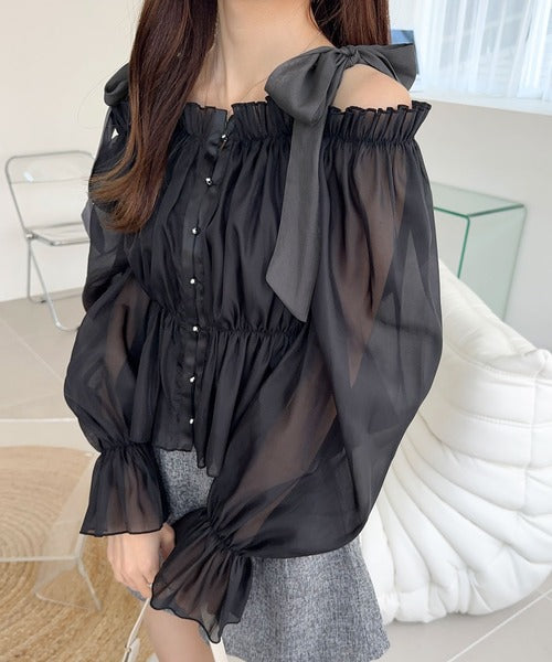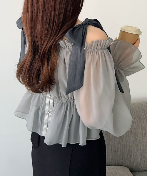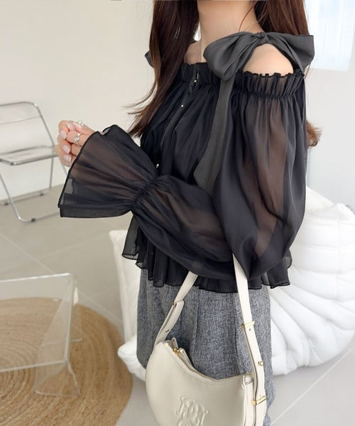 肩リボンオフショル2wayオーガンジーブラウスの登場。