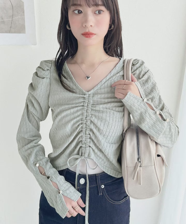 【mily bilet】カジュアルな大人ガーリーテイスト。シャーリング使い膨れジャガード袖ボタンVネックカットソー(長袖) mi1359012