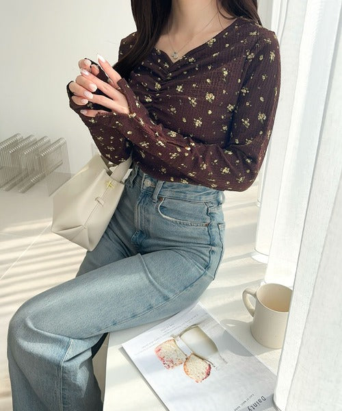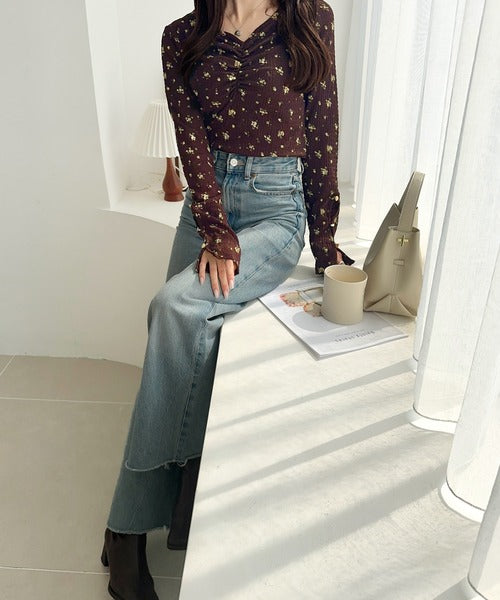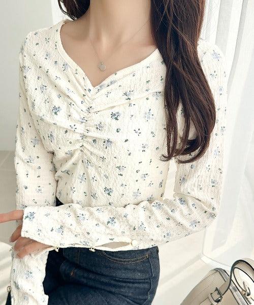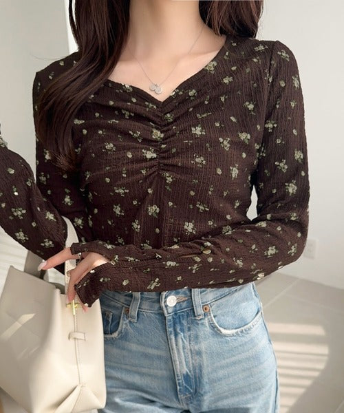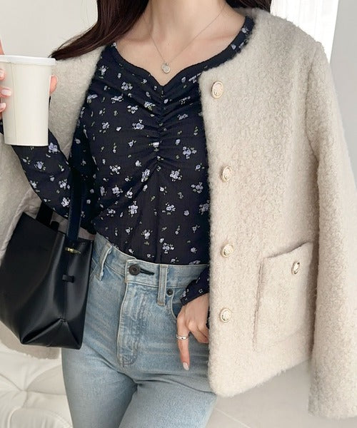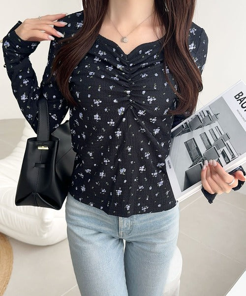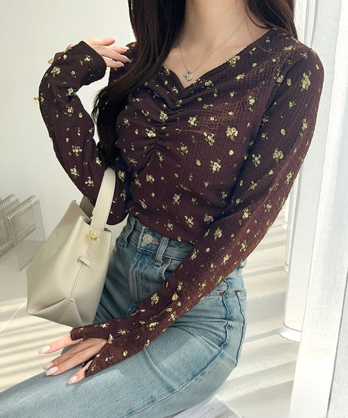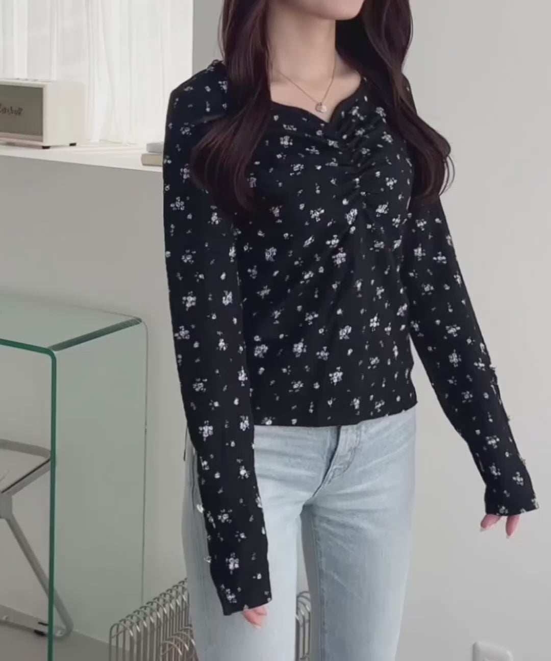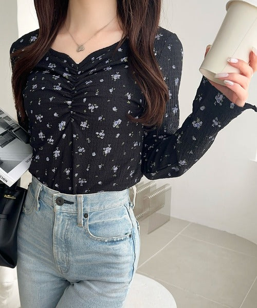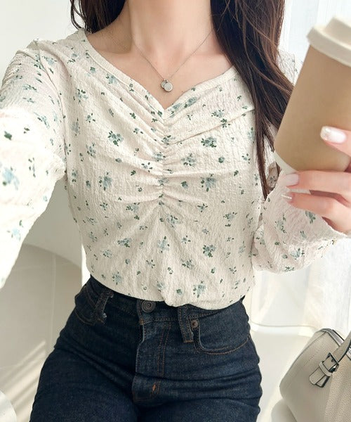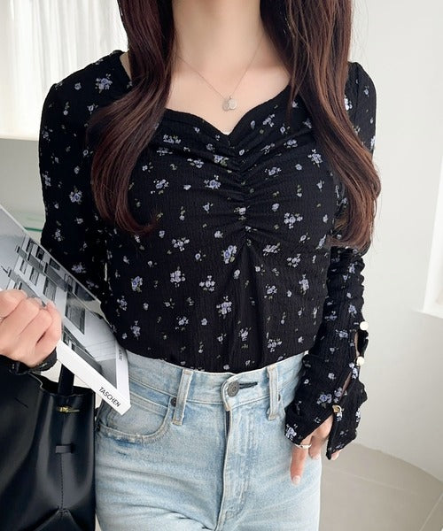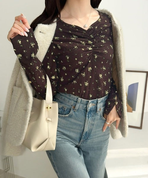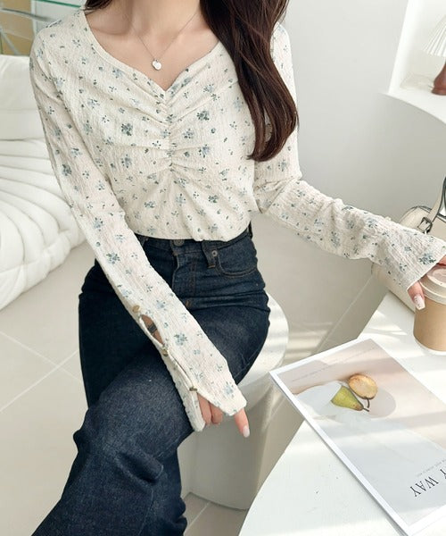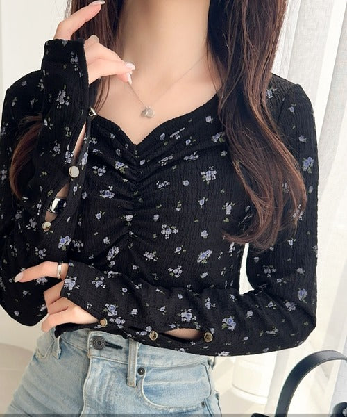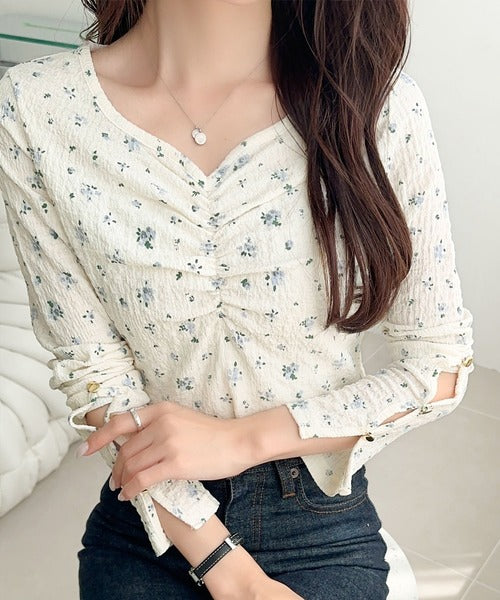 花柄の膨れが目を惹くギャザートップス。袖口のゴールドボタンが華やかさをプラスし、特別なシーンにも映えるデザインです。