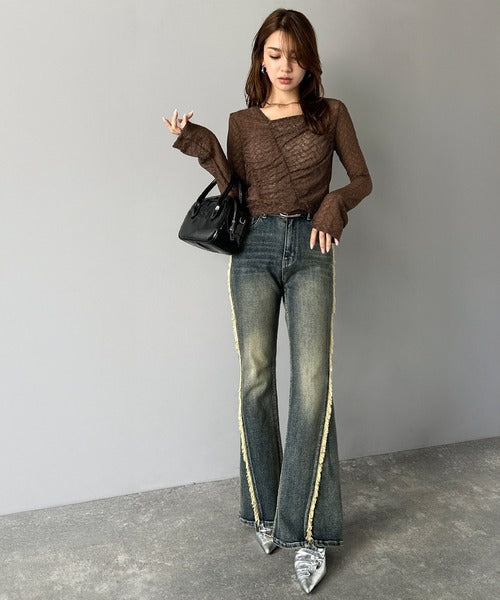 トレンドのギャザーが華やかなシアーレースアイテム。