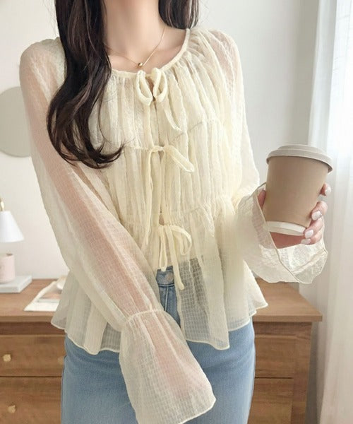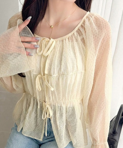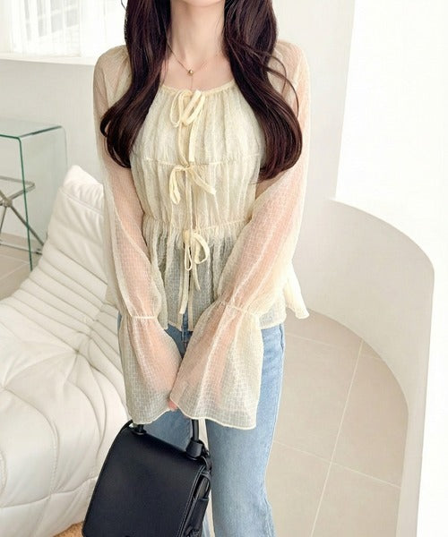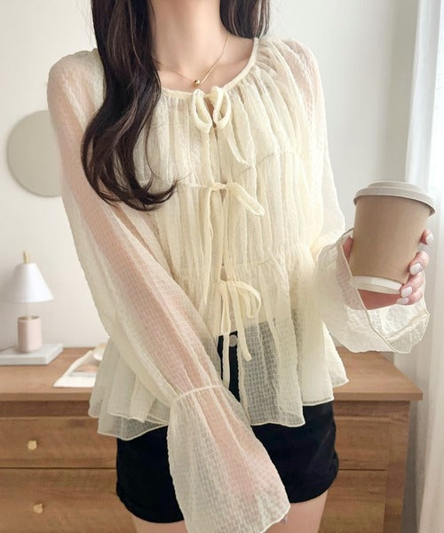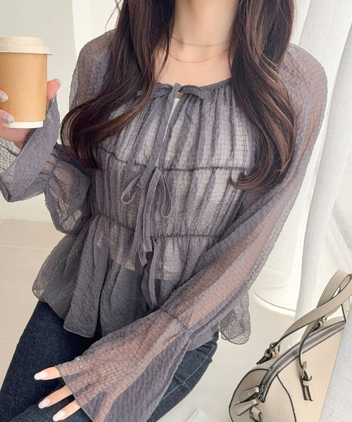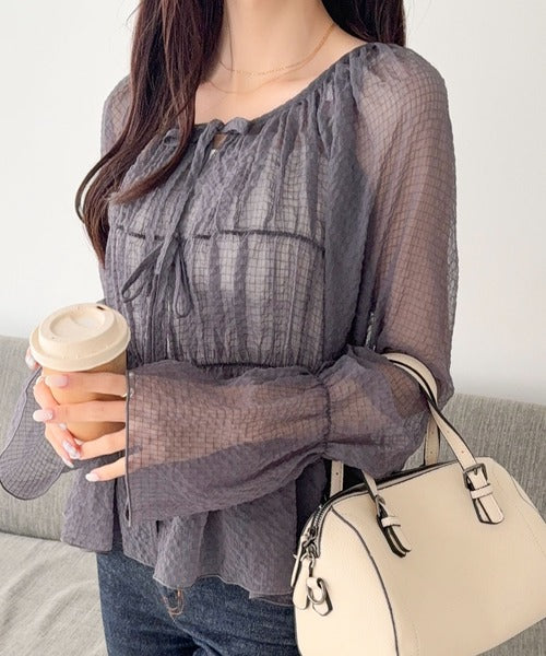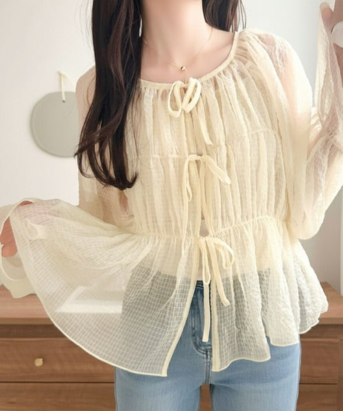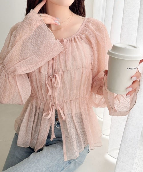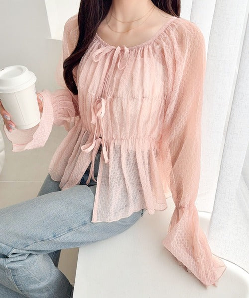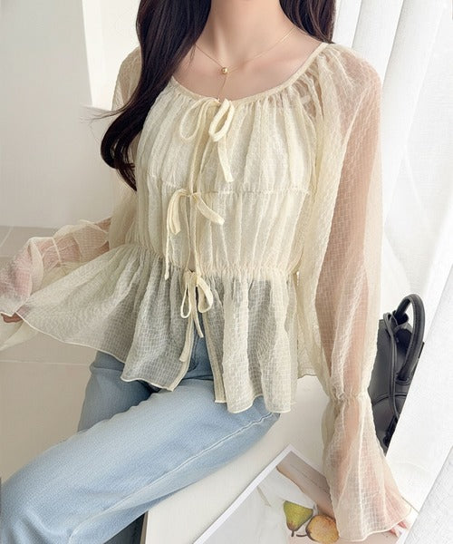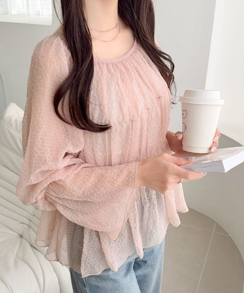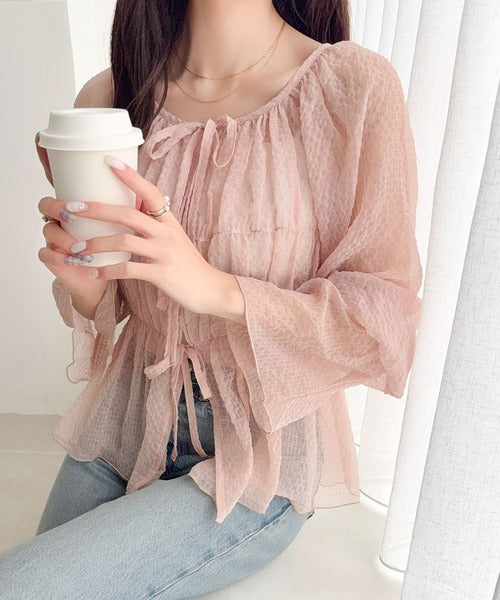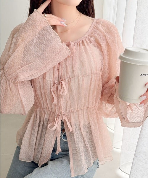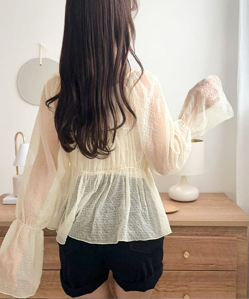 薄手で透け感のある生地が軽やかに動き、フレアスリーブが女性らしさを演出します。