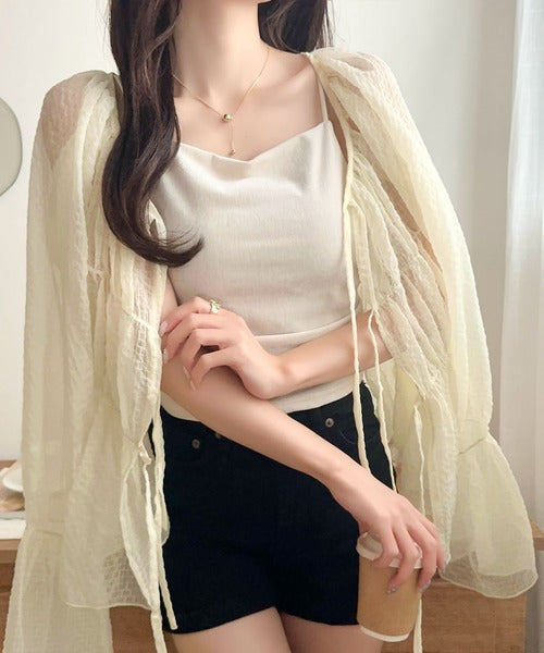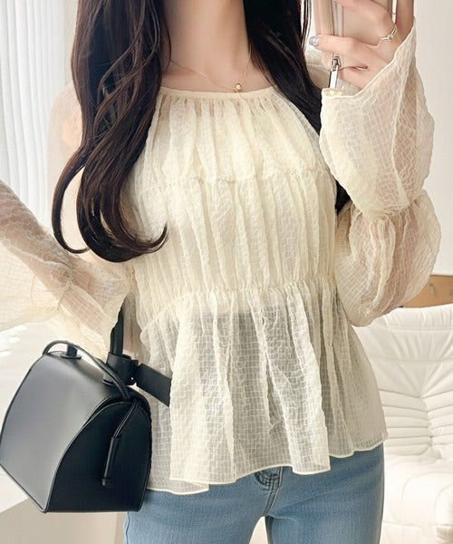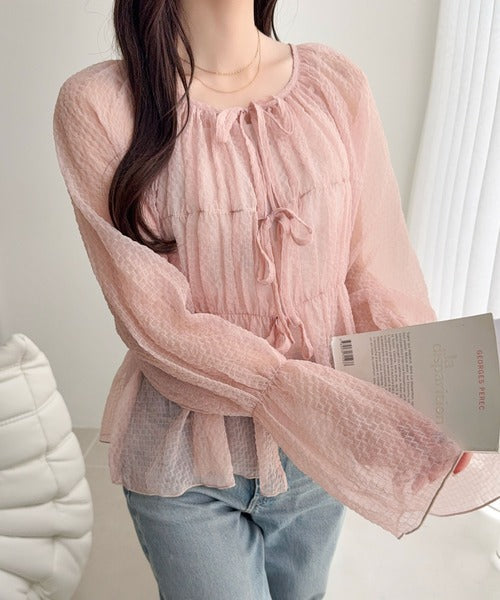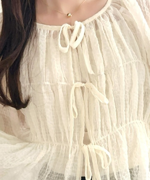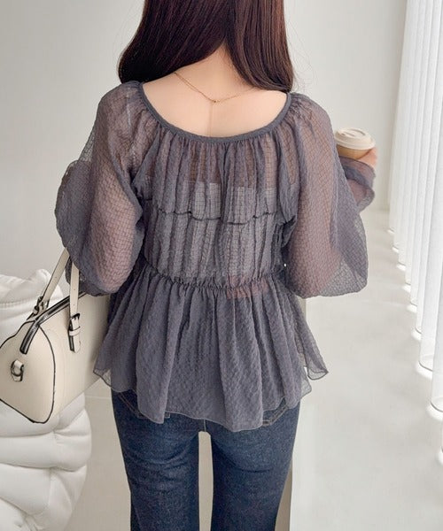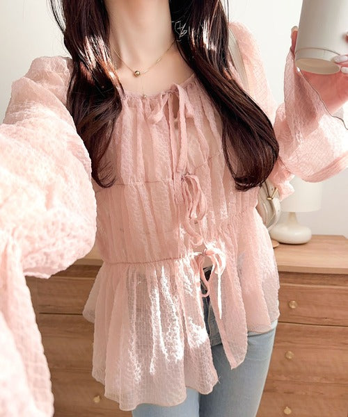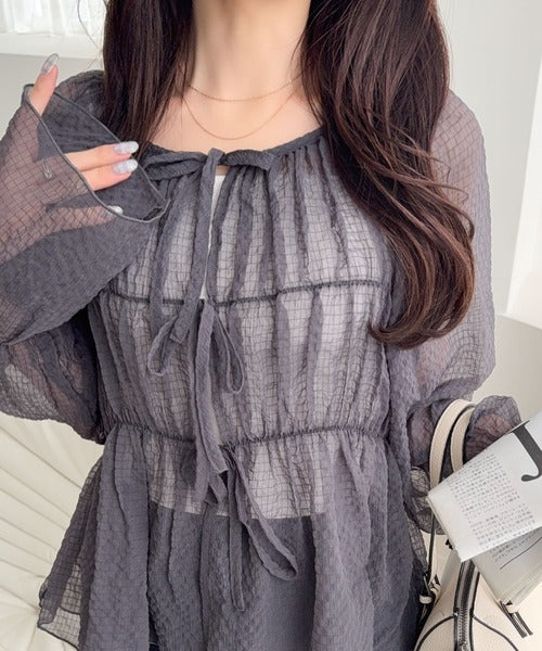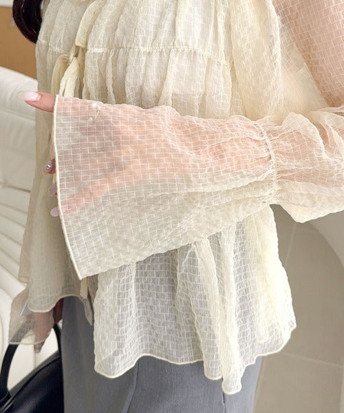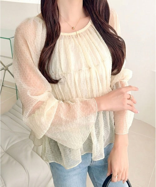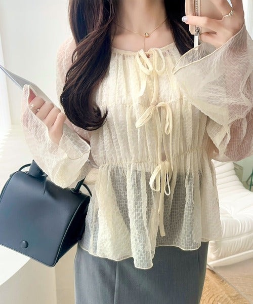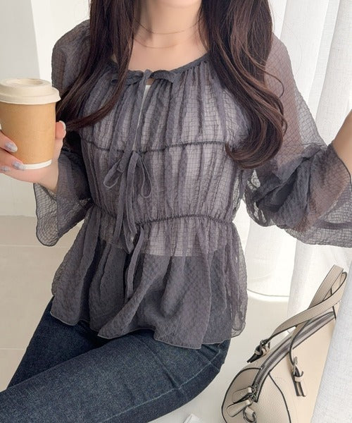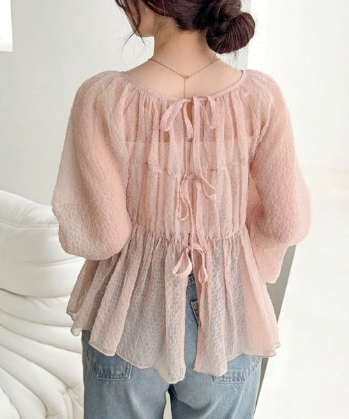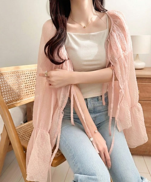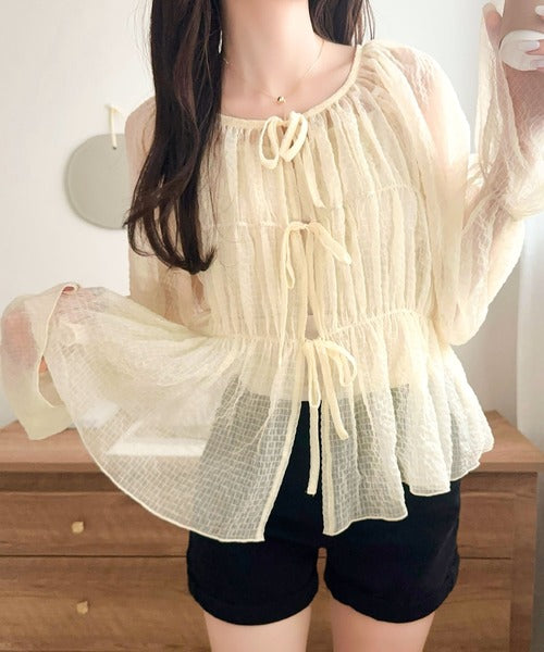 薄手で透け感のある生地が軽やかに動き、フレアスリーブが女性らしさを演出します。