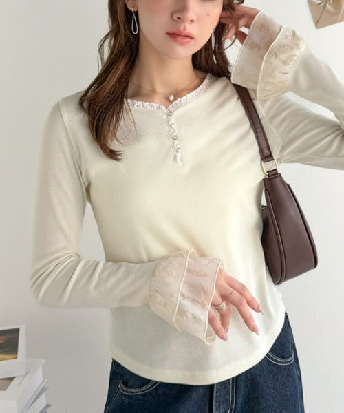 袖口のエンボス加工フリルとレースが上品に映えるインナートップス。