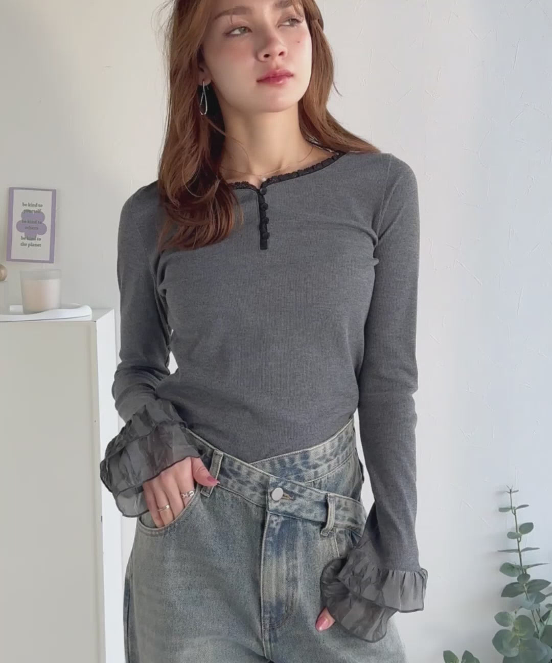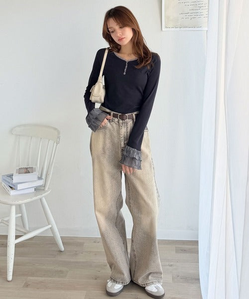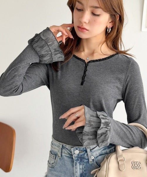 【mily bilet】大人フェミニンを叶える。袖フリルレースヘンリーネックトップス mi1359050
